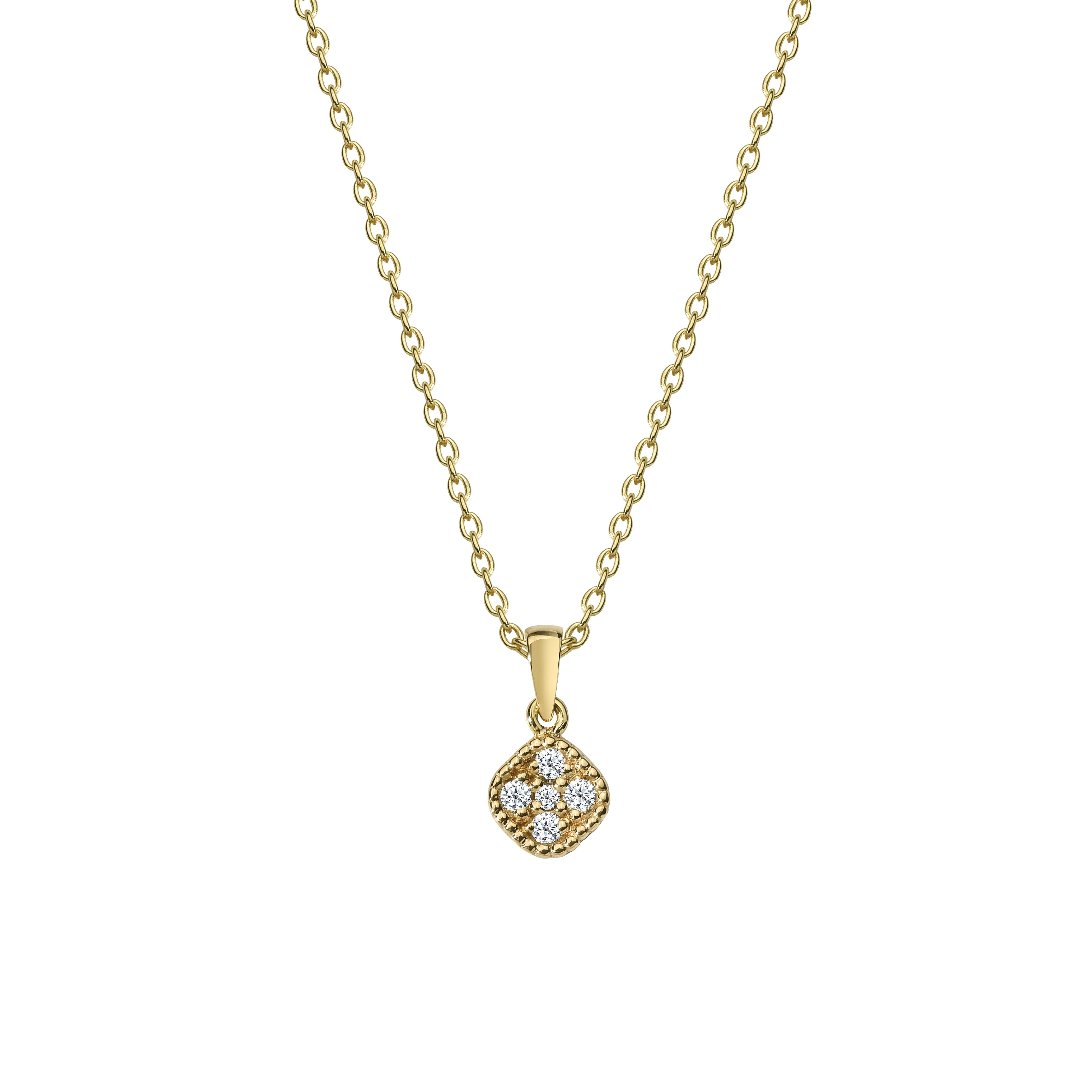 Ce fin collier est réalisé en or jaune 18 carats 750 et mesure 45 cm de longueur. Elle est sertie de cinq diamants taille brillant d'un poids total de 0,07 carat. Les diamants ont les caractéristiques de qualité FG (couleur) et SI (clarté), ce qui signifie une transparence élevée et peu d'inclusions.