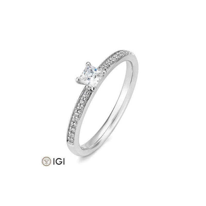 La pièce maîtresse est un diamant de laboratoire taille carrée étincelant, connu pour son attrait élégant et féminin. Entourée d'un total de 19 diamants de haute qualité cultivés en laboratoire , cette bague de fiançailles offre une brillance impressionnante tout en étant issue de sources responsables.