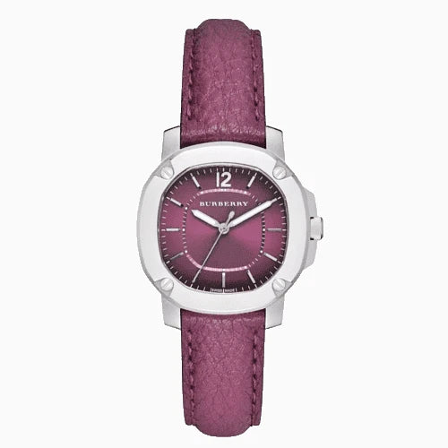 Zum Verkauf steht eine elegante Burberry BBY1715 „The Britain“ Damenarmbanduhr mit pinkem Zifferblatt und pinkem Lederarmband.