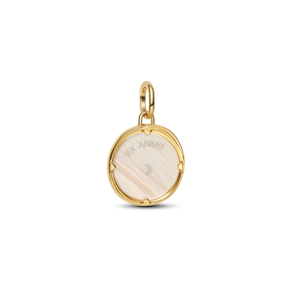 Der perlmuttartige Schimmer kontrastiert subtil mit der satinierten Textur des Goldmetalls und verleiht diesem Schmuckstück eine Aura, die zugleich antik und himmlisch wirkt. Als Symbol für Freiheit, Weisheit und spirituelle Erhebung verleiht dieser Talisman Ihren Looks poetische und kraftvolle Energie.