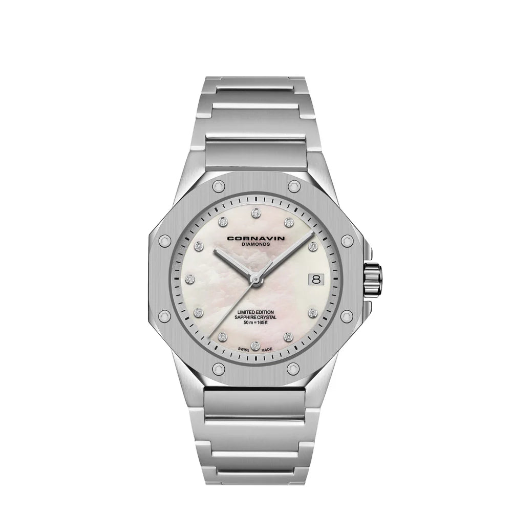 Die Downtown Sky Kollektion verbindet Weiblichkeit mit sportlicher Eleganz und verkörpert perfekt die DNA von Cornavin. Die Cornavin CO.SKY.09D.B mit ihrem bezaubernden weissen Perlmuttzifferblatt und den Leuchtzeigern bietet Präzision und Eleganz zugleich. 11 Diamanten im Einzelschliff zieren das Zifferblatt und verleihen diesem exklusiven Zeitmesser einen verspielten Glanz. Das 36mm Edelstahlgehäuse mit seinen leicht gewölbten Bandanstössen sitzt perfekt am Handgelenk und sorgt für Komfort.
