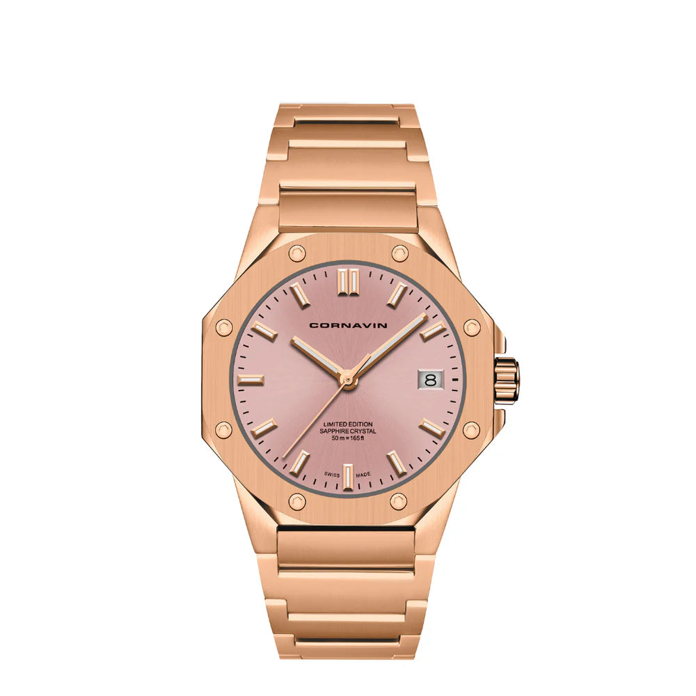 Die Downtown Sky Kollektion verbindet Weiblichkeit mit sportlicher Eleganz und verkörpert perfekt die DNA von Cornavin. Die Cornavin CO.SKY.05.B mit ihrem Zuckerwatten-Rosa Sonnenschliff-Zifferblatt und den Leuchtzeigern besticht durch Präzision und Eleganz. Das 36mm Gehäuse aus roségoldfarbenem PVD-beschichtetem Edelstahl mit seinen leicht gewölbten Bandanstössen sitzt perfekt am Handgelenk und sorgt für Komfort.