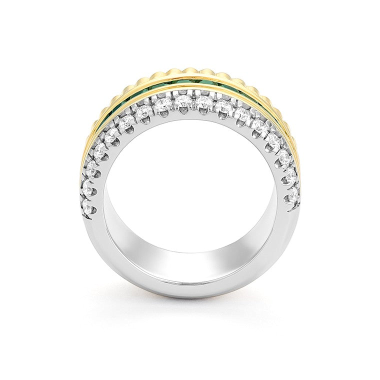 La bague est complétée par 36 diamants étincelants d'un poids total de 0,59 carat, qui ont été sertis avec la plus grande précision. L'interaction de l'or blanc précieux et de l'or jaune chaud souligne l'apparence extraordinaire et confère à ce bijou une sophistication particulière.