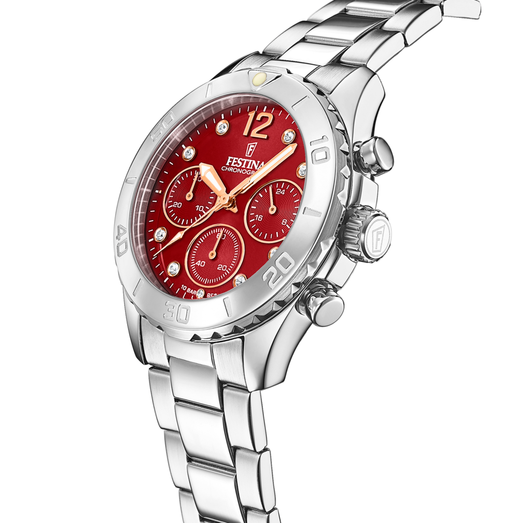 Das edle burdeosrote Zifferblatt mit sechs Nadeln wird von widerstandsfähigem Mineralglas geschützt und sorgt für eine klare, stilvolle Optik.
