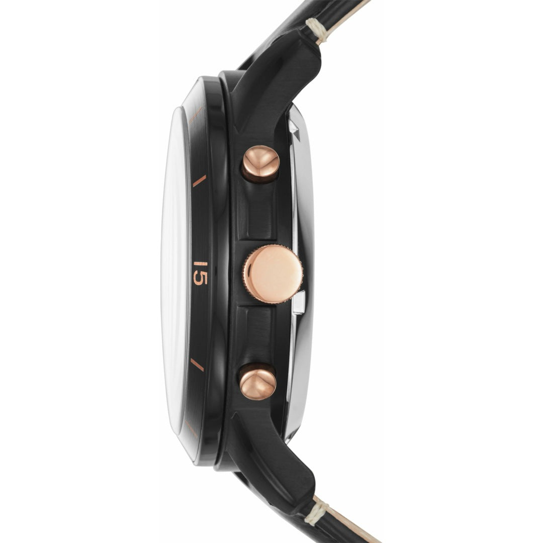 Dieses Modell überzeugt durch seine schwarzen Akzente, römische Ziffern und ein robustes Edelstahlgehäuse mit schwarzem Lederarmband, ideal für Alltag, Business oder besondere Anlässe.