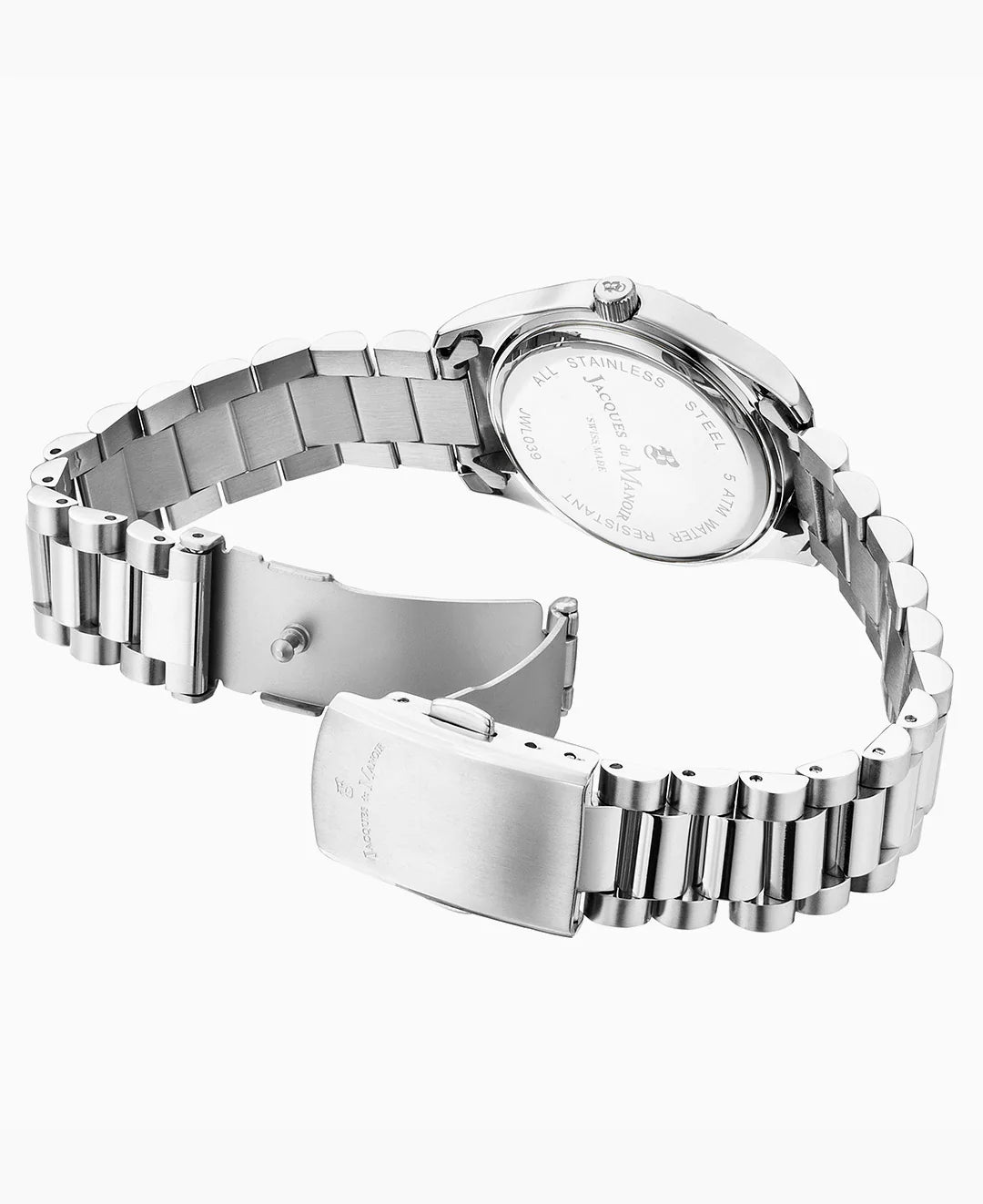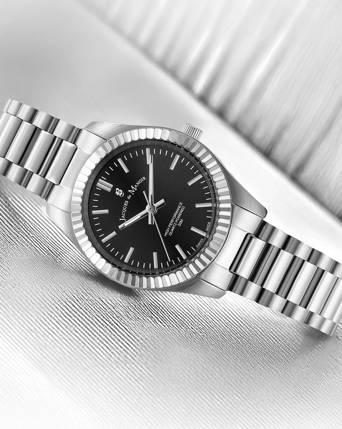 Découvrez l'élégante montre femme Jacques Du Manoir Inspiration Prime, chef-d'œuvre de l'horlogerie suisse. Cette montre Swiss Made allie un design intemporel à une technologie précise. Le boîtier rond en acier inoxydable de haute qualité a un diamètre de 31 mm et s'adapte parfaitement à n'importe quel poignet. Le cadran noir forme un contraste élégant avec le bracelet en acier inoxydable argenté. La montre est alimentée par un mouvement à quartz fiable (pile) et offre une résistance à l'eau jusqu'à 5 ATM / 50 mètres. Le cadran à 3 aiguilles (heures, minutes, secondes) est protégé par un verre minéral robuste. Cette pièce exquise est livrée dans l'emballage d'origine du fabricant, y compris les papiers et une garantie internationale de 2 ans. Bénéficiez d'un délai de livraison rapide de 1 à 5 jours ouvrés et sécurisez cette montre intemporelle !