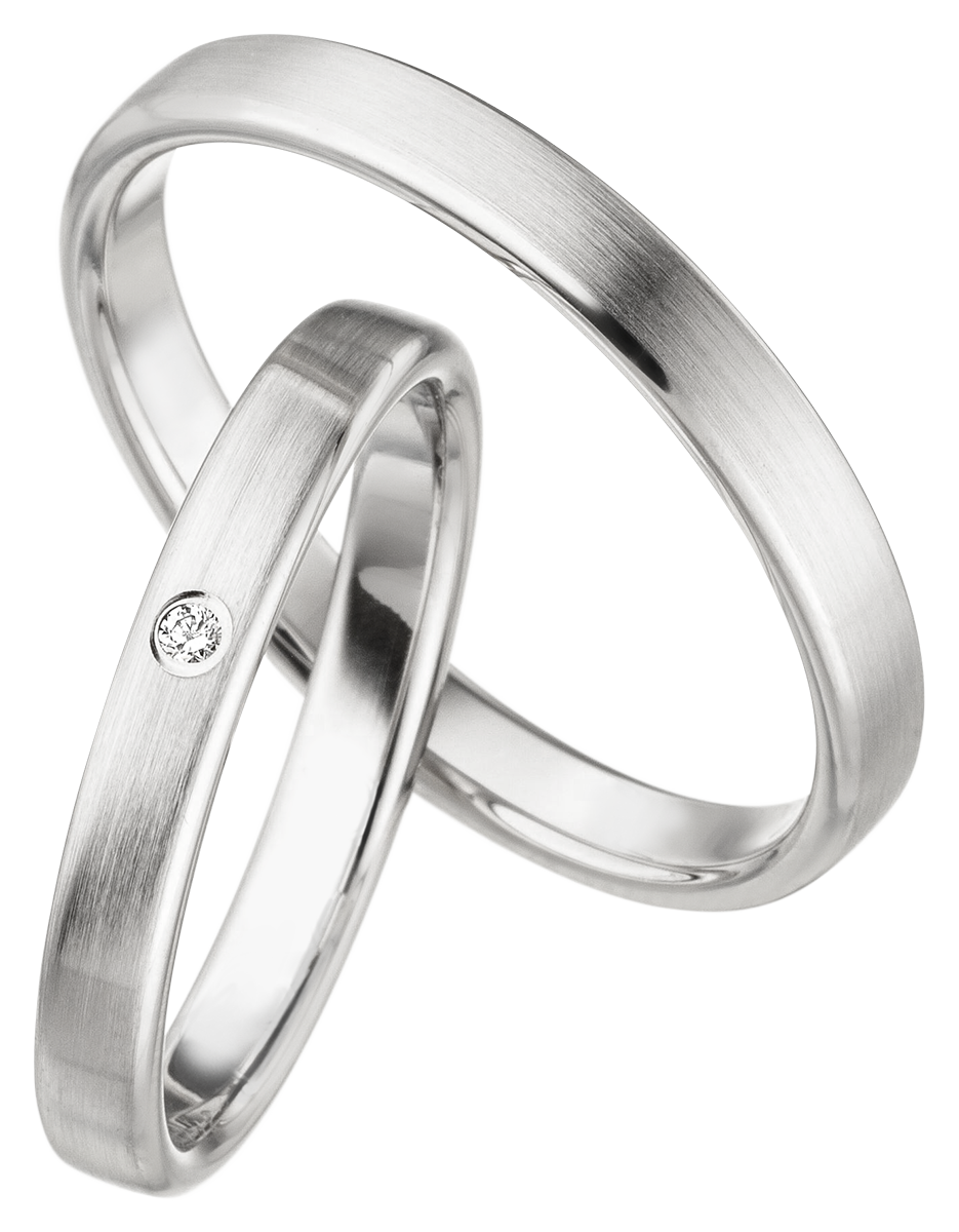 Mit einer Breite von 3,00 mm und einer feinen Höhe von 1,50 mm bieten diese Ringe angenehmen Tragekomfort. Ein funkelnder Diamant (W/si) mit 0.0135 ct. setzt einen dezenten, aber luxuriösen Akzent und unterstreicht die schlichte Eleganz dieser Trauringe.