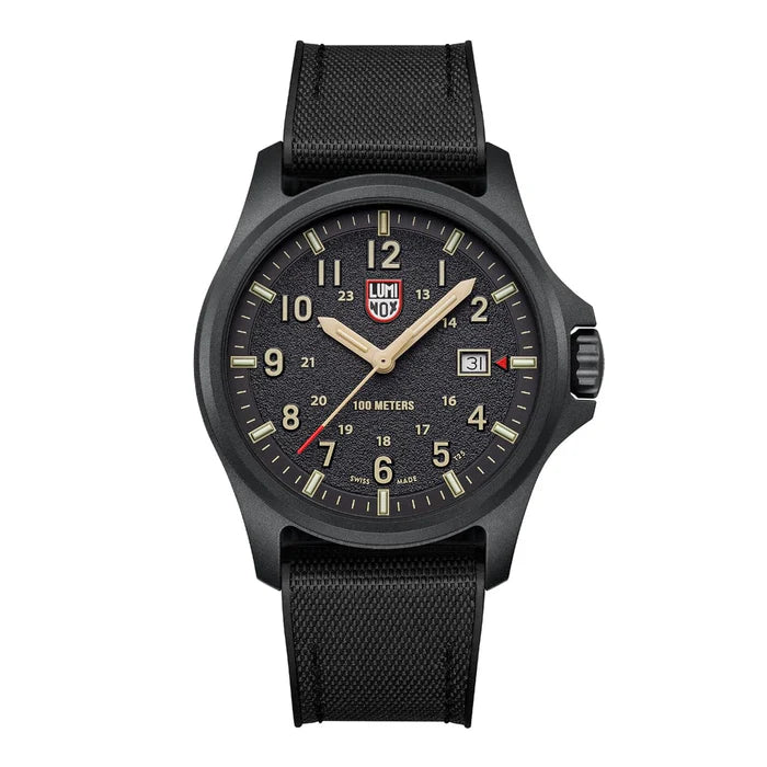 Cette montre Atacama Field 1970 s'inspire de son homonyme, le désert d'Atacama. Le design avec le cadran noir et les chiffres couleur sable avec une surface texturée rappelle le paysage rude du désert. La montre est dotée d'un grand cadran avec affichages 12 et 24 heures, d'une trotteuse rouge et d'une flèche rouge à côté de la date à 3 heures, qui est instantanément lisible. Le cadran est protégé par un verre saphir antireflet. Le boîtier CARBONOX™ de 43 mm est associé à un bracelet en caoutchouc noir, qui peut également être échangé contre le deuxième bracelet inclus, un bracelet NATO couleur sable.