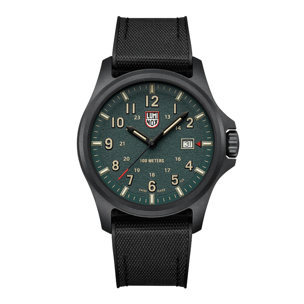 Cette montre Atacama Field 1970 s'inspire de son homonyme, le désert d'Atacama. Le design avec le cadran vert foncé et les chiffres couleur sable avec une surface texturée rappelle le paysage rude du désert. La montre est dotée d'un grand cadran avec affichages 12 et 24 heures, d'une trotteuse rouge et d'une flèche rouge à côté de la date à 3 heures, qui est instantanément lisible. Le cadran est protégé par un verre saphir antireflet. Le boîtier CARBONOX™ de 43 mm est associé à un bracelet en caoutchouc noir.