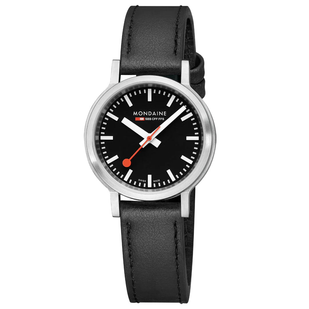 Le cadran blanc et le boîtier en acier inoxydable brossé de 34 mm sont associés à un bracelet en cuir de raisin vegan noir.