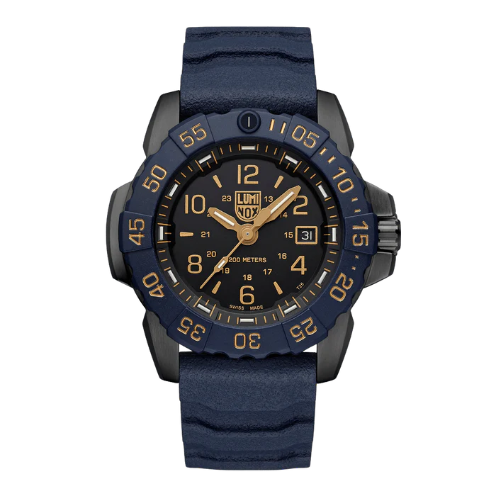 La Navy SEAL Foundation 3250 « Back To The Blue » célèbre le retour des opérations des Navy SEAL en mer après deux décennies dominées par les opérations terrestres et dans le désert. Présentant une combinaison frappante d'accents bleu ombre, noir et or, cette montre robuste est dotée d'un boîtier en acier inoxydable de 45 mm avec placage IP noir et d'une lunette tournante unidirectionnelle en fibre de verre bleue. Le logo de la Navy SEAL Foundation est gravé sur le fond du boîtier en acier inoxydable avec revêtement noir, qui est vissé pour augmenter la résistance à l'eau. Avec jusqu'à 20 ATM, 16 tubes Luminox Light Technology et un mouvement à quartz suisse, ce garde-temps est non seulement élégant pour un usage quotidien, mais aussi un compagnon fiable dans n'importe quel environnement au-dessus et au-dessous de l'eau.