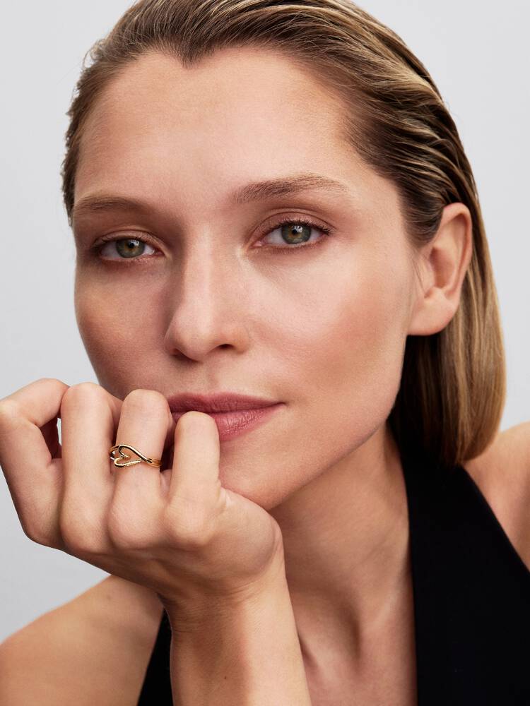 Der vergoldete Ring kombiniert skulpturales Design mit minimalistischem Stil und setzt ein dezentes, aber ausdrucksstarkes Statement. Seine offene Herzform verleiht jedem Look eine besondere Dynamik – perfekt für den Alltag oder als stilvoller Akzent zu besonderen Anlässen.
