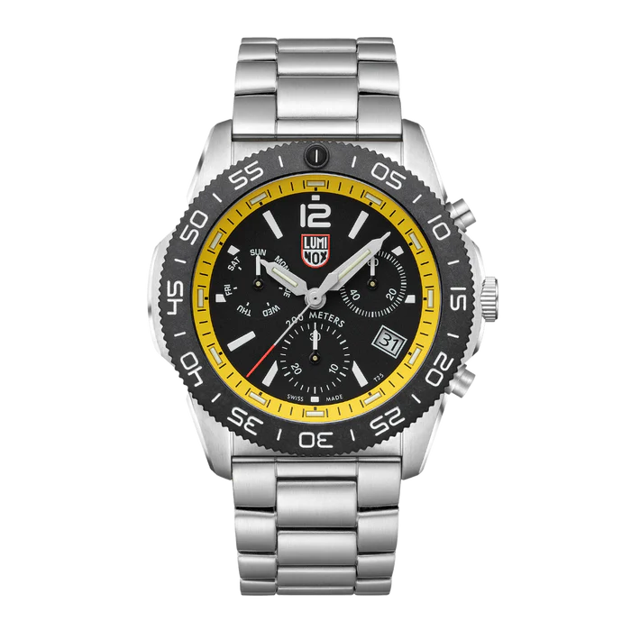 Ce design élégant et sportif est doté d'un boîtier en acier inoxydable de 44 mm avec une lunette rotative unidirectionnelle CARBONOX™ - essentielle pour chaque plongeur. Le chronographe avec un cadran noir, trois sous-cadrans ton sur ton et une bague intérieure jaune vif est doté d'un bracelet à changement rapide en acier inoxydable 316L - pour un ajustement facile et parfait. Comme toutes les autres montres Luminox, la Pacific Diver est dotée de la technologie Luminox Light, qui garantit une lisibilité inégalée dans toutes les conditions d'éclairage jusqu'à 25 ans.