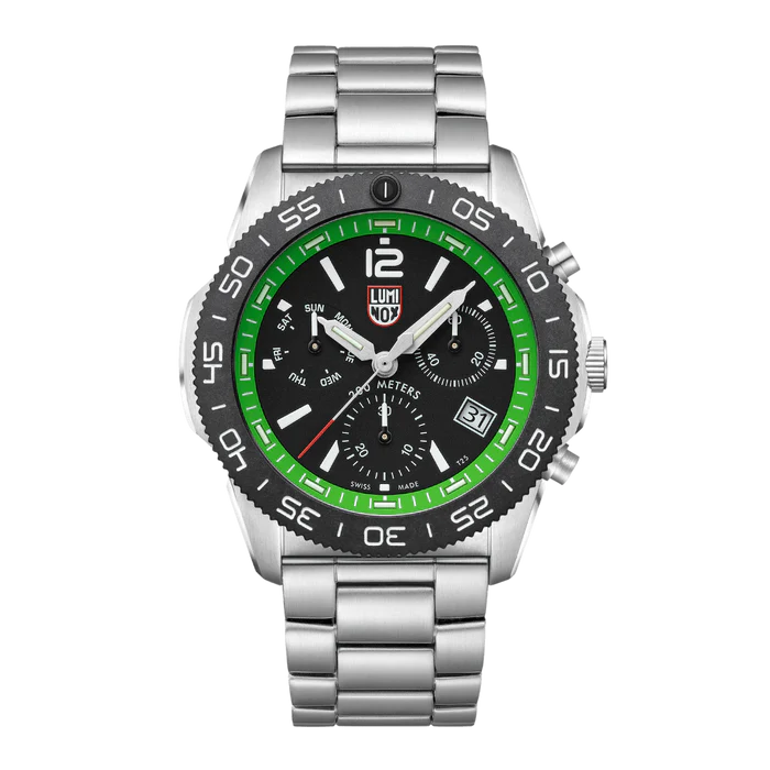 Ce design élégant et sportif est doté d'un boîtier en acier inoxydable de 44 mm avec une lunette rotative unidirectionnelle CARBONOX™ - essentielle pour chaque plongeur. Le chronographe avec un cadran noir, trois sous-cadrans ton sur ton et une bague intérieure vert vif est doté d'un bracelet à changement rapide en acier inoxydable 316L - pour un ajustement facile et parfait. Comme toutes les autres montres Luminox, la Pacific Diver est dotée de la technologie Luminox Light, qui garantit une lisibilité inégalée dans toutes les conditions d'éclairage jusqu'à 25 ans.