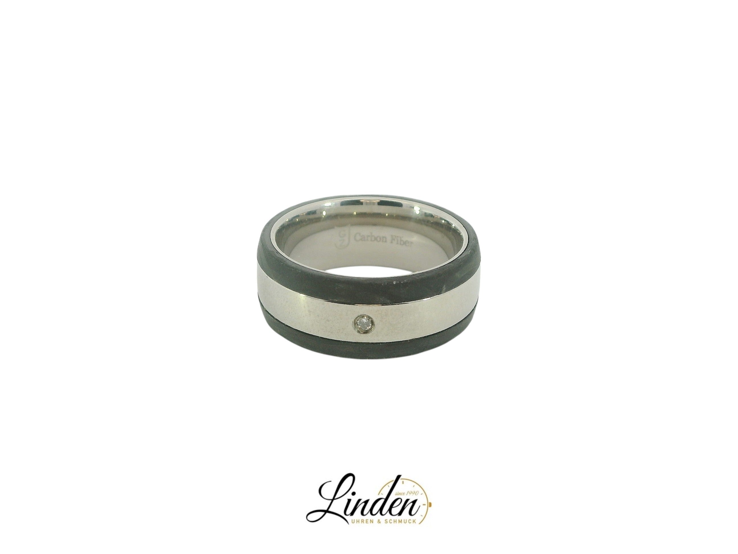 Die Kombination aus dunklem Carbon und glänzendem Stahl sorgt für eine moderne und zugleich zeitlose Optik. Der eingefasste Brillant verleiht dem Ring eine dezente, elegante Note – ideal für Paare mit Stilbewusstsein.