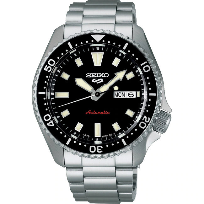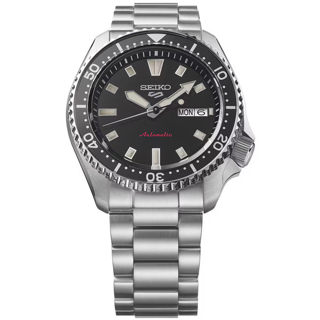 Das schwarze Zifferblatt mit leuchtenden Zeigern und Indizes sorgt für optimale Ablesbarkeit, während das silberne Edelstahlarmband dem Modell eine zeitlose Ausstrahlung verleiht. Die markante drehbare Lünette und das klassische Gehäusedesign greifen den Stil der beliebten SKX-Linie authentisch auf, jedoch in einer zeitgemäss überarbeiteten Form.