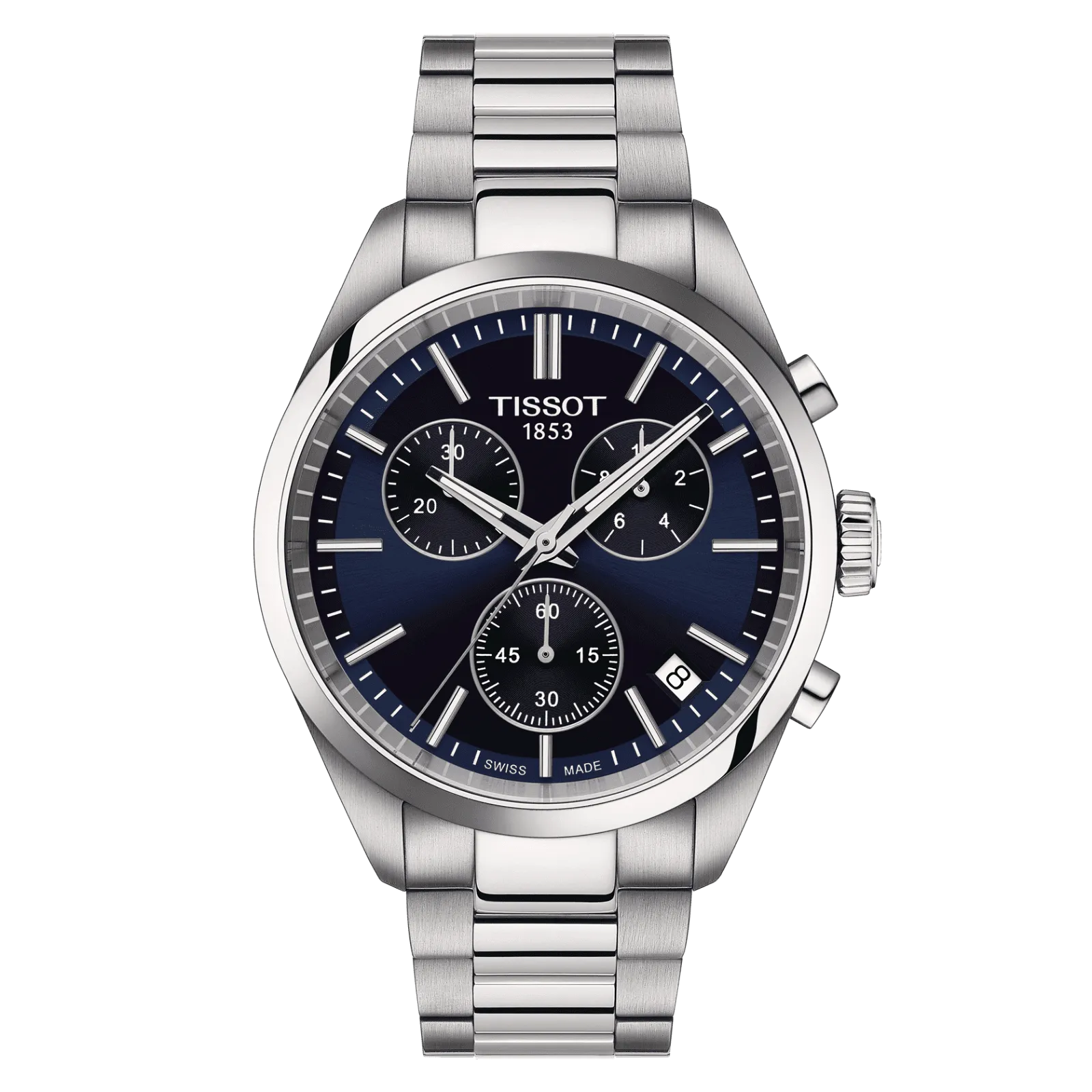 Ce modèle Tissot PR 100 Chronograph est doté d'un boîtier en acier inoxydable 316L de 40 millimètres et d'un mouvement à quartz précis de fabrication suisse avec indicateur de fin de pile. Son cadran bleu foncé avec index bâtons et affichage de la date est bien protégé sous un verre saphir résistant aux rayures. Des totalisateurs, c'est-à-dire des sous-cadrans, à 2, 6 et 11 heures indiquent respectivement les dixièmes de seconde, les secondes et les 30 minutes. Le bracelet en acier inoxydable 316L, solide mais flexible, permet un remplacement facile et sans outil grâce au système de changement rapide. Il est doté d'un fermoir papillon avec poussoirs.