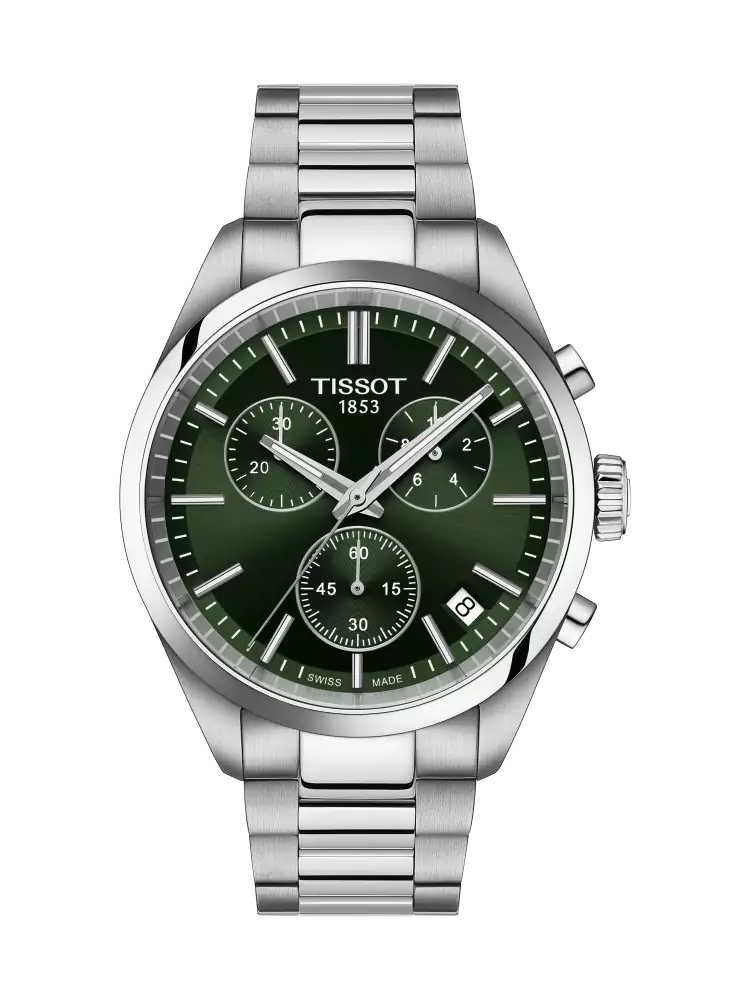 Ce modèle Tissot PR 100 Chronograph est doté d'un boîtier en acier inoxydable 316L de 40 millimètres et d'un mouvement à quartz précis de fabrication suisse avec indicateur de fin de pile. Son cadran vert foncé avec index bâtons et affichage de la date est bien protégé sous un verre saphir résistant aux rayures. Des totalisateurs, c'est-à-dire des sous-cadrans, à 2, 6 et 11 heures indiquent respectivement les dixièmes de seconde, les secondes et les 30 minutes. Le bracelet en acier inoxydable 316L, solide mais flexible, permet un remplacement facile et sans outil grâce au système de changement rapide. Il est doté d'un fermoir papillon avec poussoirs.