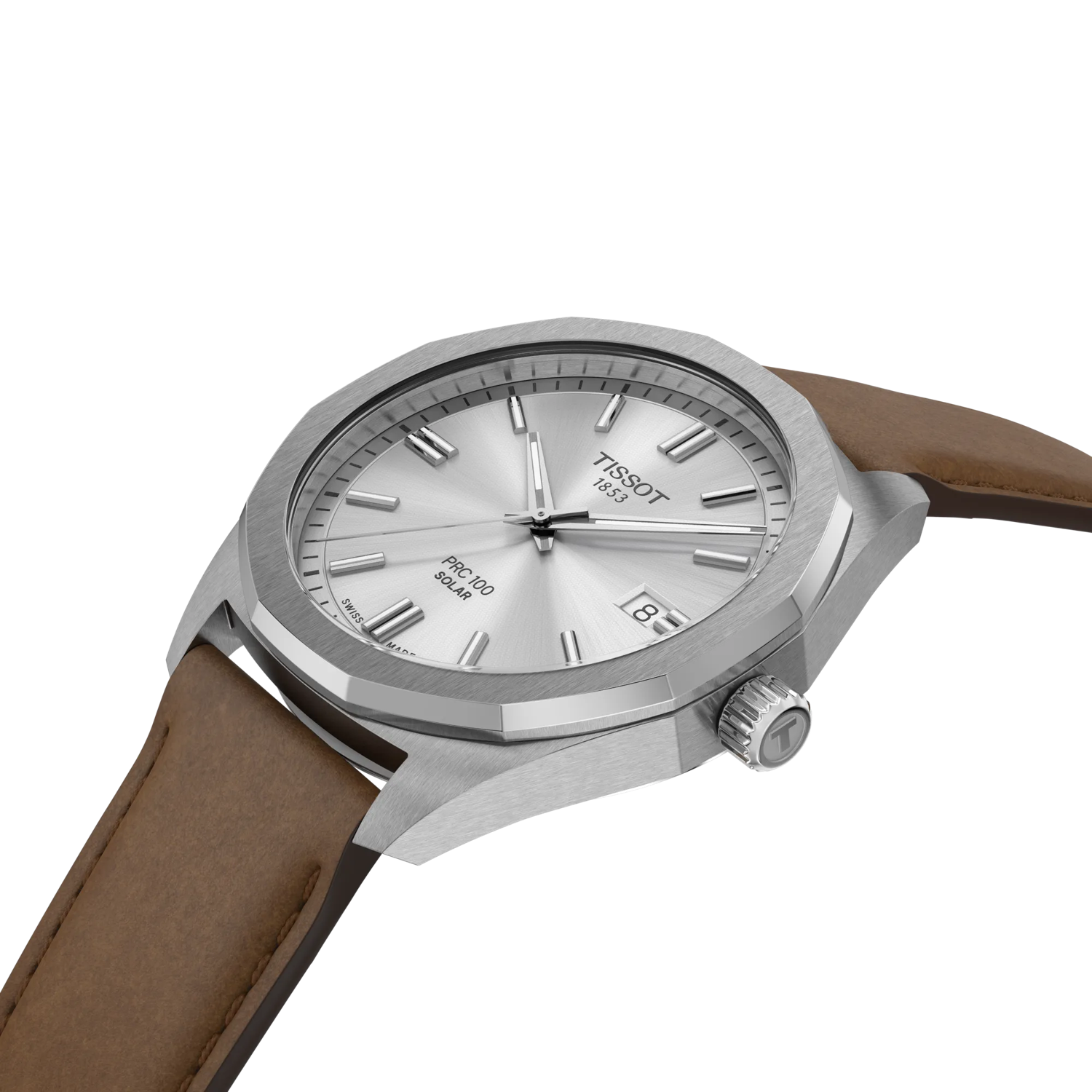 Cette version Tissot PRC 100 Solar Quartz 39 mm possède un cadran argenté avec affichage de la date. Le bracelet en cuir marron souple avec fermoir papillon et poussoirs maintient la montre en toute sécurité sur votre poignet.