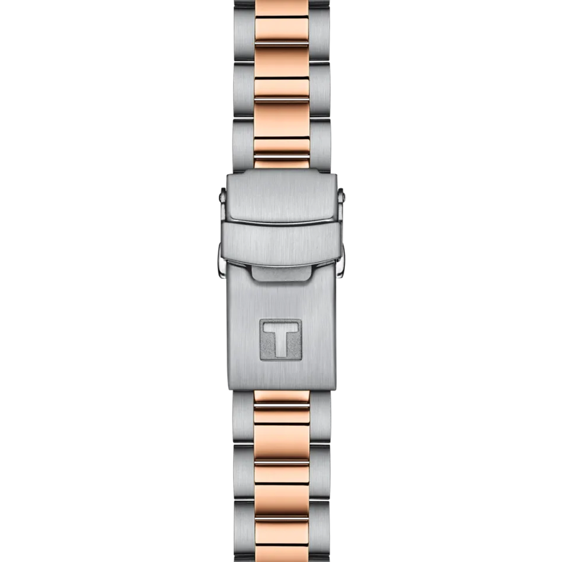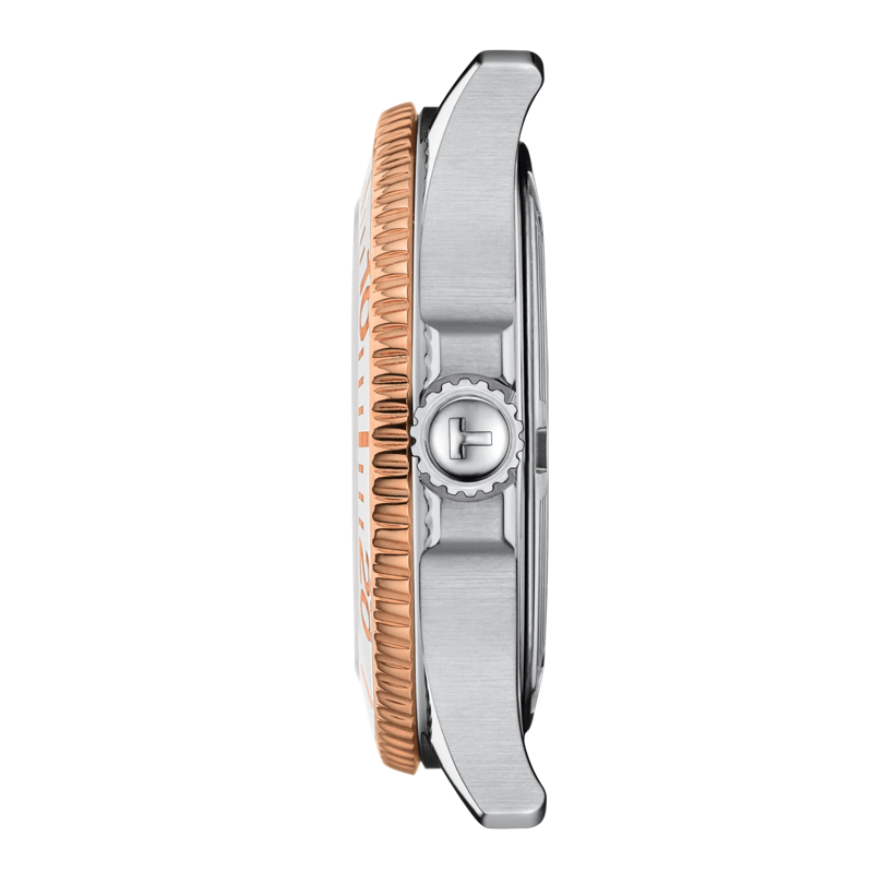 Ce modèle Tissot Seastar 1000 36 mm est doté d'une lunette tournante bicolore unidirectionnelle, blanche avec un revêtement PVD or rose sur le pourtour. Les chiffres et les marquages sur la lunette sont également de couleur or rose. Le cadran en nacre blanche avec affichage de la date est doté d'aiguilles et d'index de couleur or rose avec un généreux revêtement en matériau lumineux blanc Super-LumiNova® qui brille en vert dans le noir. Le bracelet en acier inoxydable 316L, avec revêtement PVD or rose également bicolore, est équipé d'un système de changement rapide et d'une boucle déployante avec fermoir de sécurité et poussoirs.