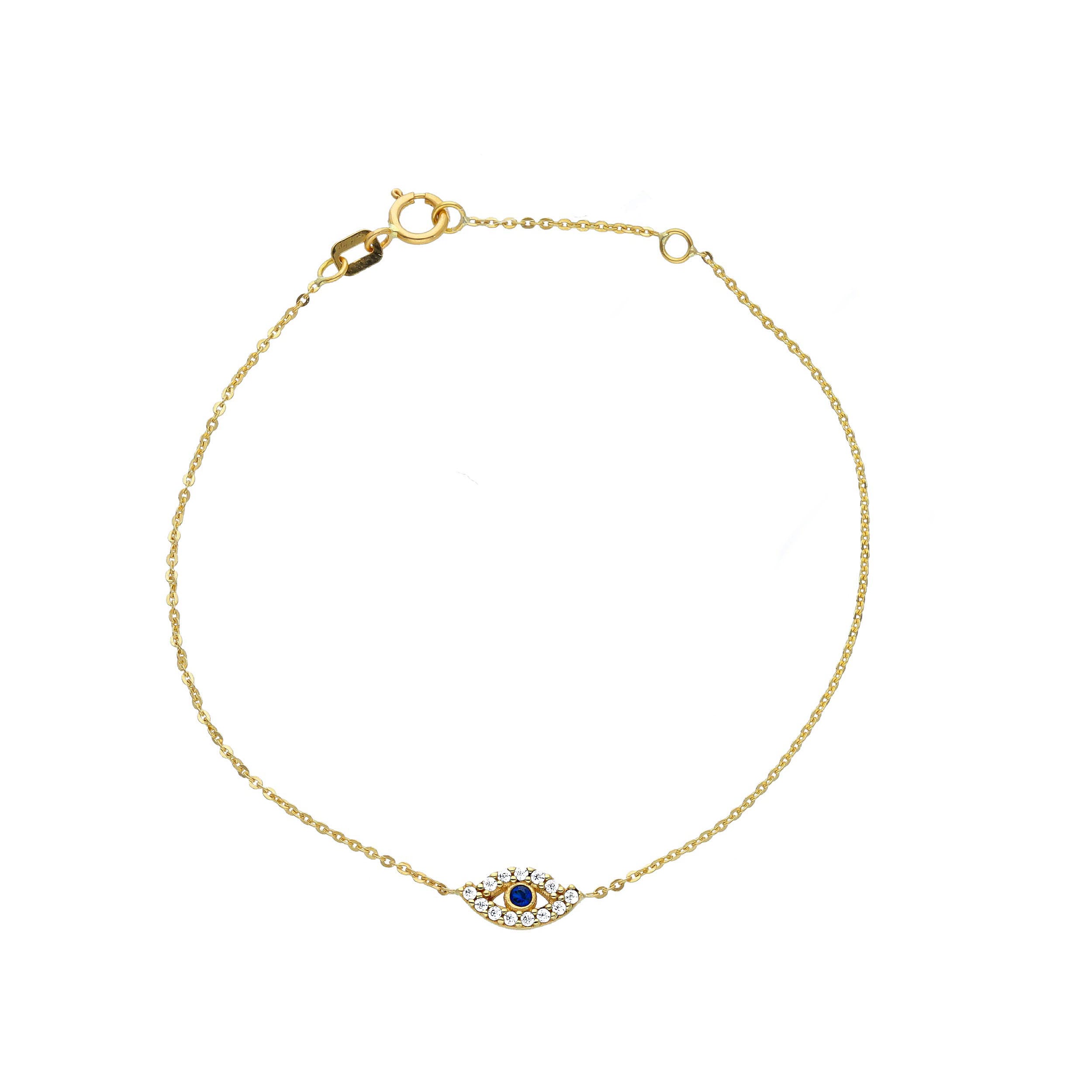 Verleihen Sie Ihrem Look eine besondere Bedeutung mit unserem 18 Karat Goldarmband mit Nazar-Auge. Dieses feine Schmuckstück besteht aus 18 Karat Gelbgold (750) und ist mit funkelnden Zirkoniasteinen verziert. Das Nazar-Auge symbolisiert Schutz und Glück, während das zarte Gewicht von nur 1.06 Gramm für höchsten Tragekomfort sorgt.