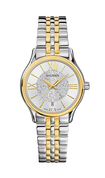 Die Balmain Beleganza ist eine kunstvolle Damenuhr, die zeitlosen Stil mit einem modernen Design verbindet, inspiriert von der Pariser Haute Couture. Ihr weisses Arabesken-Zifferblatt und die klassischen römischen Ziffern verleihen ihr eine selbstbewusste Note. Das 32 mm grosse Bicolor-Edelstahlgehäuse mit gelbgoldener PVD-Beschichtung, schlankem Profil von 6,27 mm und passendem Armband bietet elegante Raffinesse für den Alltag. Dieses Swiss-Made-Zeitmesser ist mit kratzfestem Saphirglas ausgestattet.