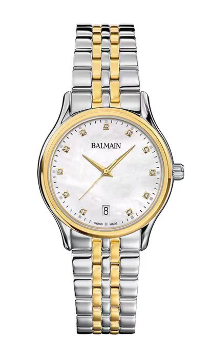 Die Balmain Beleganza ist eine anmutige Damenuhr, die zeitlose Eleganz mit einem modernen Design verbindet, inspiriert von der Pariser Haute Couture. Ihr weisses Perlmutt-Zifferblatt mit klassischen römischen Ziffern verleiht ihr eine selbstbewusste Ausstrahlung, während das 32 mm grosse Bicolor-Edelstahlgehäuse mit gelbgoldener PVD-Beschichtung, schlankem Profil von 6,27 mm und passendem Armband alltägliche Eleganz bietet. Dieses Swiss-Made-Zeitmesser ist mit kratzfestem Saphirglas ausgestattet.