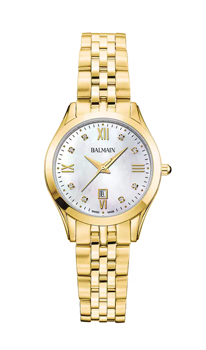 Die Balmain Classic R B4112.31.75 kombiniert luxuriöses Design mit präziser Schweizer Technik. Das 30 mm Edelstahlgehäuse mit PVD Beschichtung in Gold harmoniert elegant mit dem passenden Edelstahlarmband. Auf dem weissen Perlmutt-Zifferblatt funkeln 8 Diamanten (0.030 Karat) dezent und stilvoll. Das kratzfeste Saphirglas schützt zuverlässig, während das ETA F05.115 Quarzwerk exakte Zeit liefert. Wasserdicht bis 5 bar und geliefert in Originalbox mit 2 Jahren Garantie – ideal für Frauen, die klassische Eleganz mit einem Hauch Luxus schätzen.