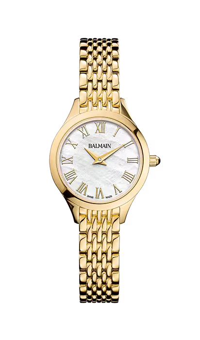Die Balmain de Balmain Damenuhr (B4930.33.82) vereint edles Design mit Schweizer Präzision. Das runde 316L-Edelstahlgehäuse mit PVD-Beschichtung und das elegante goldfarbene Edelstahlarmband sorgen für einen luxuriösen Auftritt. Das strahlend weiße Perlmuttzifferblatt wird von kratzfestem Saphirglas geschützt, während das präzise ETA 902.002 Quarzwerk für zuverlässige Zeitmessung sorgt. Mit 5 bar (50 m) Wasserdichtigkeit ist sie sowohl stilvoll als auch alltagstauglich. Geliefert in der originalen Balmain Box mit 2 Jahren internationaler Garantie.