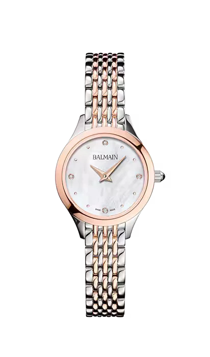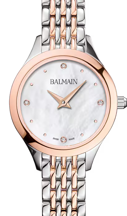 Die Balmain de Balmain Damenuhr (B4930.33.85) besticht durch elegantes Design und funkelnde Details. Das runde 316L-Edelstahlgehäuse mit PVD-Beschichtung und das Bicolor Edelstahlarmband verleihen der Uhr einen luxuriösen Look. Das weisse Perlmutt-Zifferblatt ist mit vier Diamanten (Top Wesselton VS-SI, 0,015 Karat) dezent veredelt und wird von kratzfestem Saphirglas geschützt. Für präzise Zeitmessung sorgt das ETA 902.002 Quarzwerk. Mit 5 bar (50 m) Wasserdichtigkeit ist die Uhr alltagstauglich und wird in der originalen Balmain Box mit 2 Jahren internationaler Garantie geliefert.