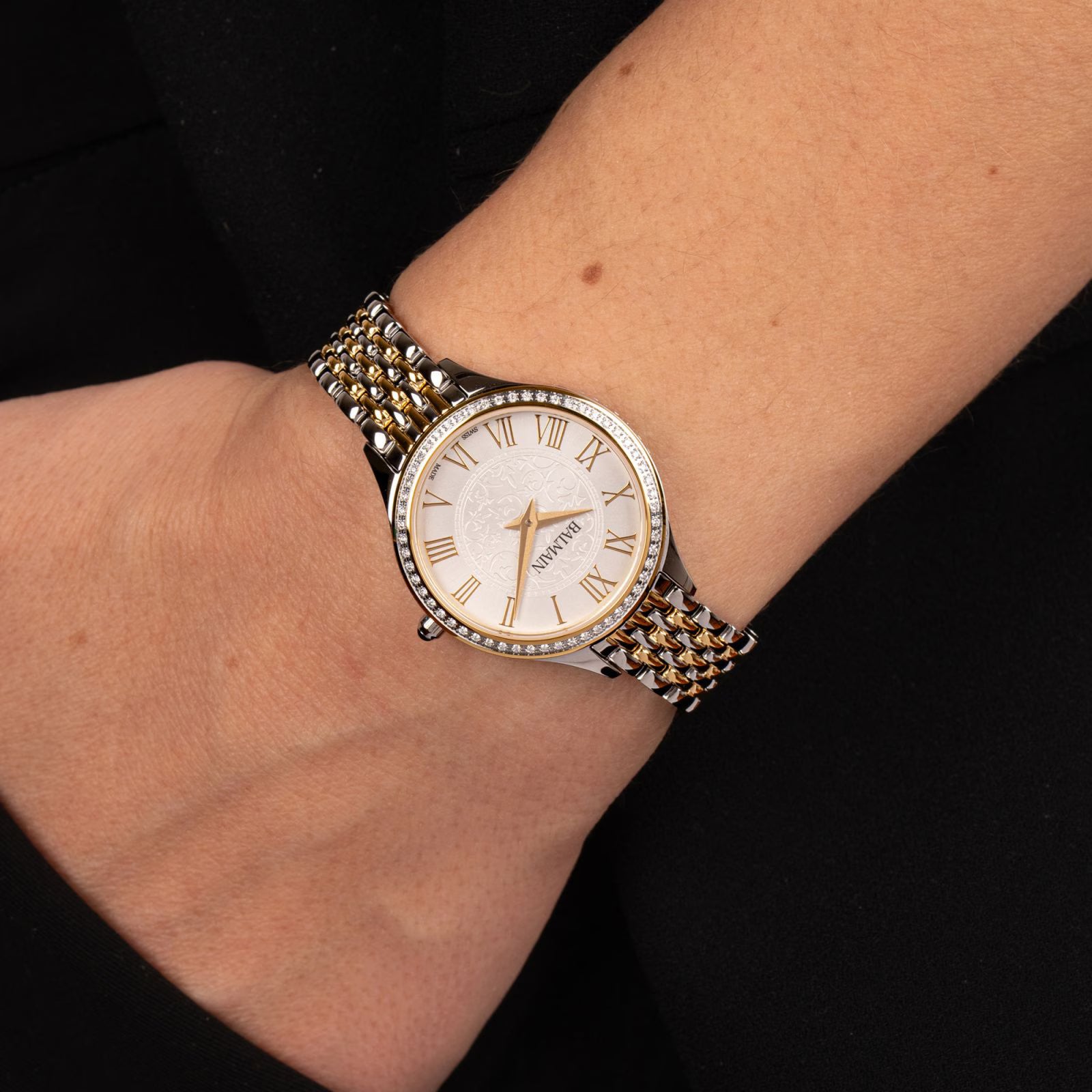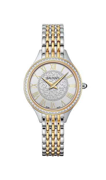 Die Balmain de Balmain B3917.39.12 ist eine elegante Damenuhr mit 29 mm Edelstahlgehäuse und edler PVD Beschichtung. Das bicolor Armband und das silberne Zifferblatt mit 56 Diamanten (0.221 Karat) verleihen ihr besonderen Glanz. Geschützt durch kratzfestes Saphirglas und angetrieben vom präzisen Schweizer Quarzwerk ETA 901.001, bietet sie Stil und Zuverlässigkeit. Wasserdicht bis 5 bar und geliefert in Originalbox mit 2 Jahren Garantie – perfekt für Frauen mit Sinn für Eleganz.