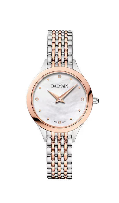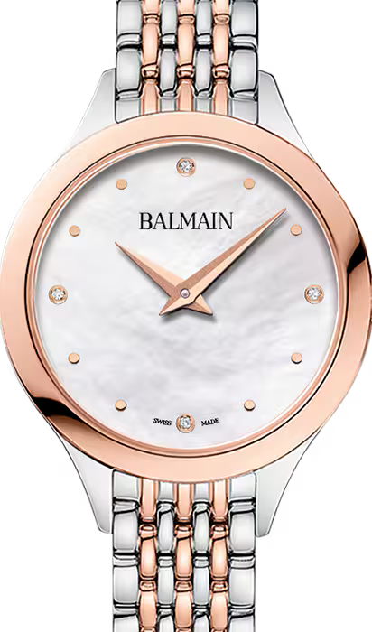 Die Balmain de Balmain B3918.33.85 kombiniert luxuriöse Optik mit Schweizer Präzision. Das 29 mm Edelstahlgehäuse mit PVD Beschichtung in Bicolor und das elegante Edelstahlarmband unterstreichen den edlen Charakter. Auf dem weissen Perlmutt-Zifferblatt setzen 4 Diamanten (0.015 Karat) dezente Glanzpunkte. Das kratzfeste Saphirglas schützt zuverlässig, während das ETA 901.001 Quarzwerk für exakte Zeit sorgt. Wasserdicht bis 5 bar und geliefert in Originalbox mit 2 Jahren Garantie – ideal für Frauen mit Sinn für feine Details.