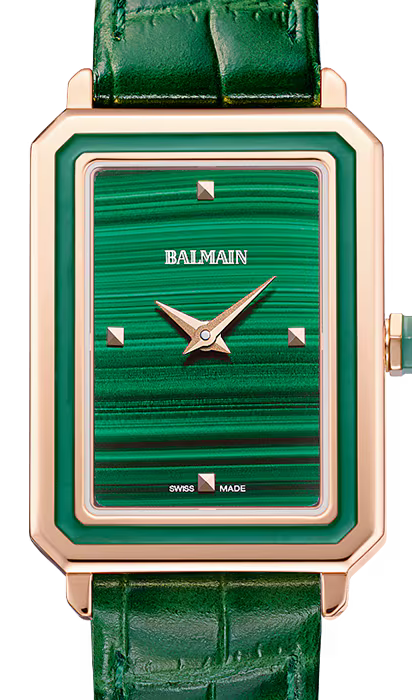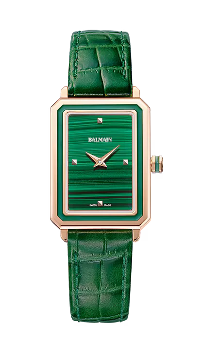 Ihr rechteckiges 316L-Edelstahlgehäuse mit PVD-Beschichtung (25 x 33 mm) umrahmt ein einzigartiges Zifferblatt in Malachitgrün, das an die faszinierenden Farbstrukturen des Edelsteins erinnert.