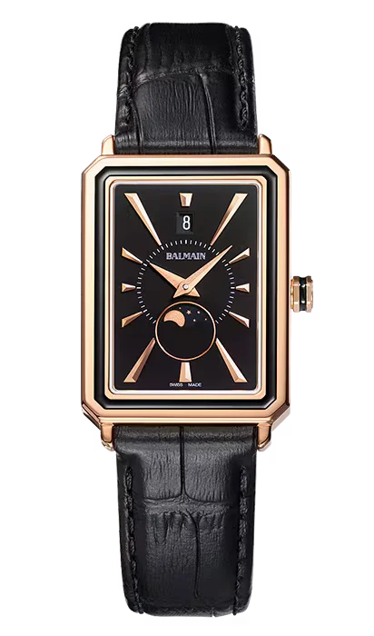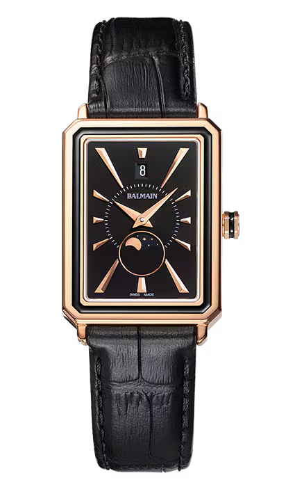 Das rechteckige Gehäuse mit edler PVD-Beschichtung und das schwarze Lederarmband in Krokodil-Optik sorgen für eine harmonisch elegante Optik – perfekt für Alltag und Abendgarderobe.
