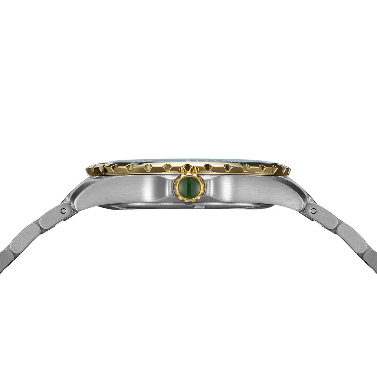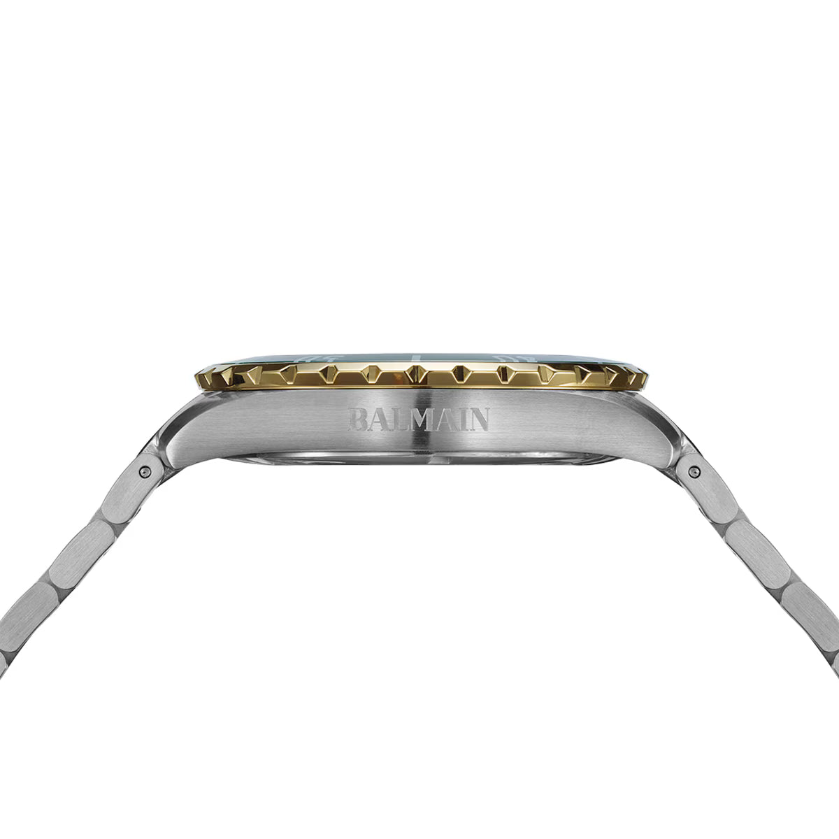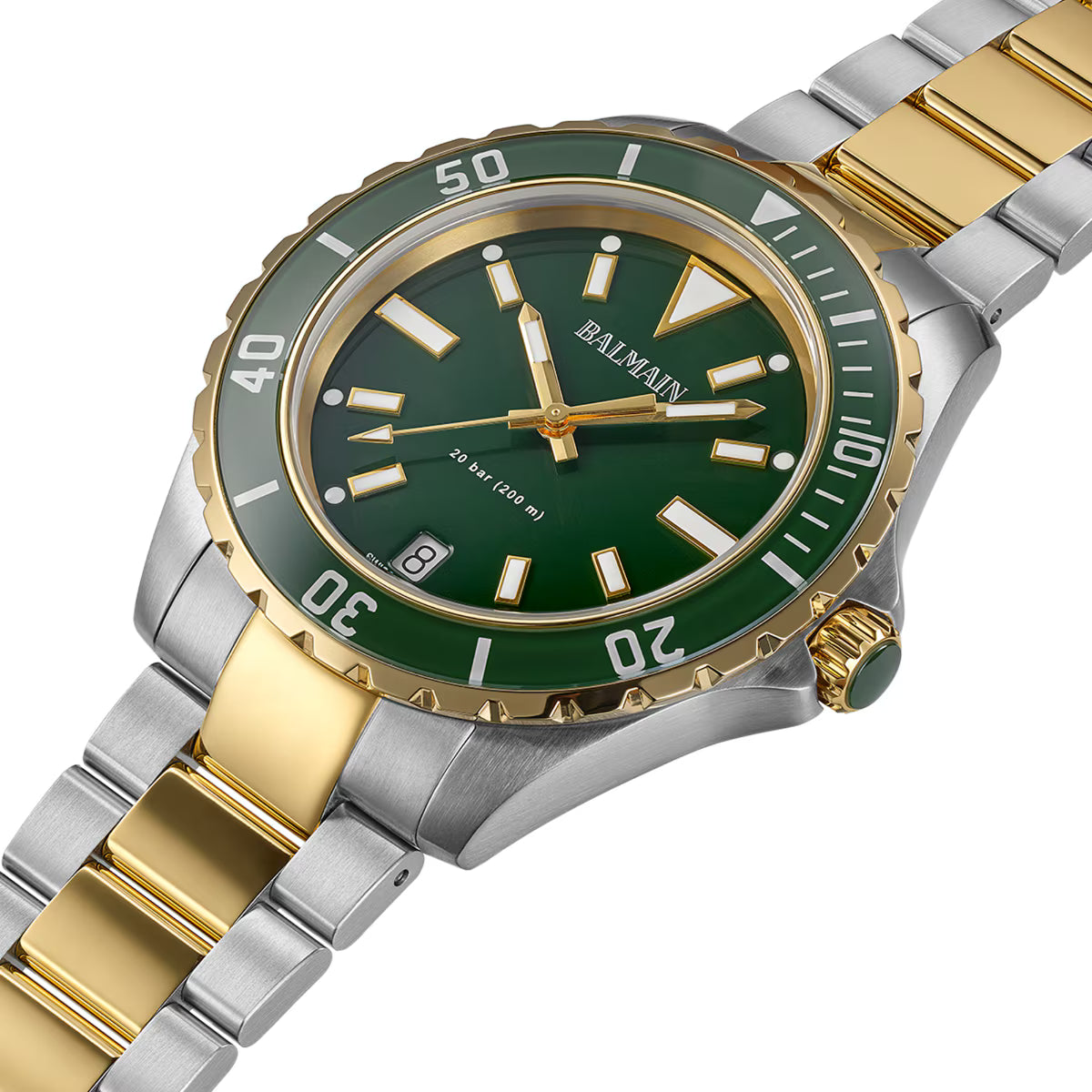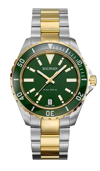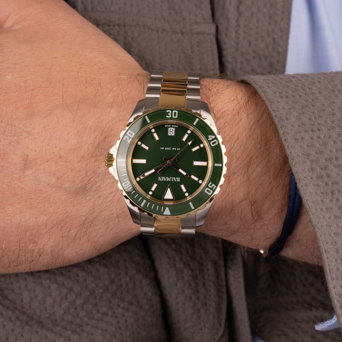 Die Balmain Ophrys (Ref. B4342.39.75) verbindet markante Farbgebung mit Schweizer Präzision. Das 42,50 mm Gehäuse aus 316L-Edelstahl mit goldfarbener PVD-Beschichtung und das elegante bicolor Edelstahlarmband setzen stilvolle Akzente. Das tiefgrüne Zifferblatt liegt geschützt unter kratzfestem Antireflex-Saphirglas. Angetrieben vom präzisen ETA F07.115 Quarzwerk und wasserdicht bis 20 bar (200 m) ist diese Uhr robust und elegant zugleich. Lieferung in der originalen Balmain Box mit 2 Jahren internationaler Garantie.