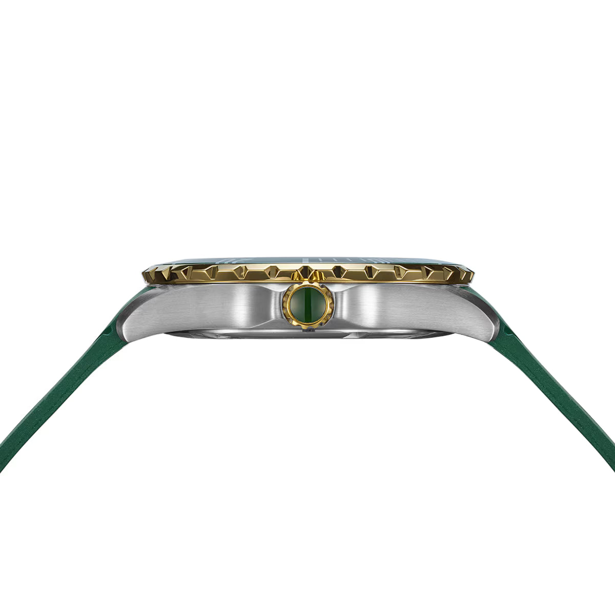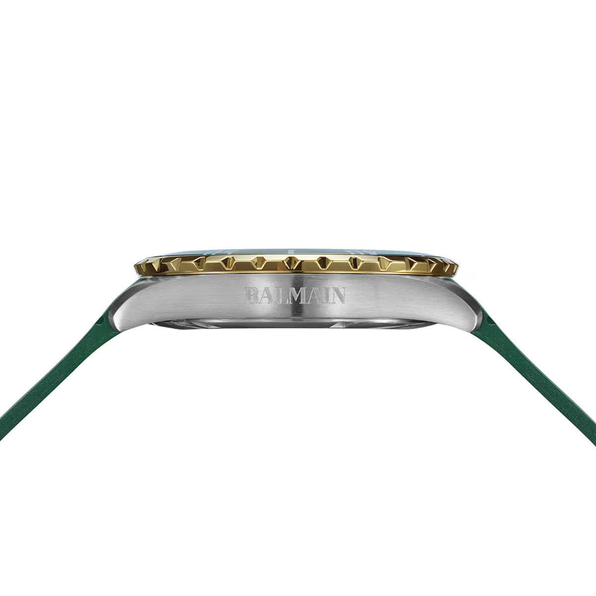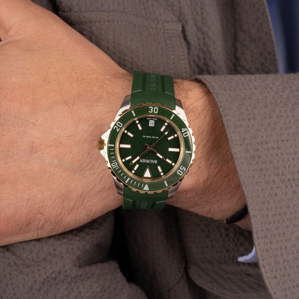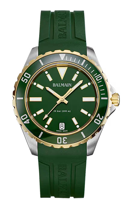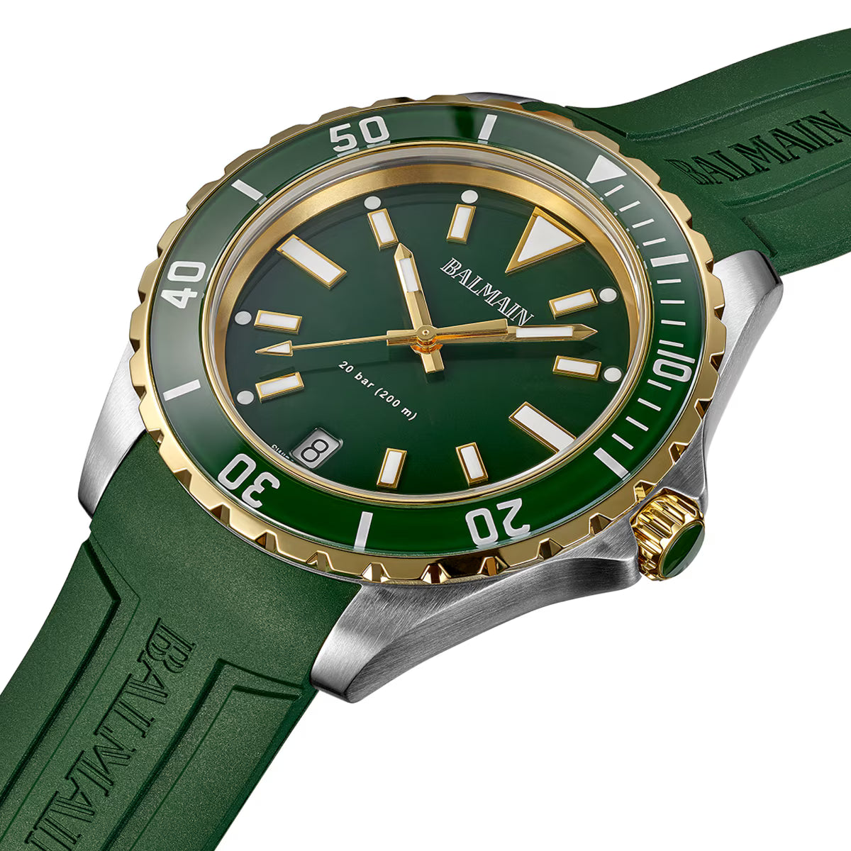 Die Balmain Ophrys (Ref. B4342.92.75) vereint markantes Design mit sportlicher Funktionalität. Das 42,50 mm Gehäuse aus 316L-Edelstahl mit PVD-Beschichtung wird durch ein robustes grünes Kautschukarmband ergänzt. Passend dazu präsentiert sich das grüne Zifferblatt unter kratzfestem Antireflex-Saphirglas. Im Inneren sorgt das präzise ETA F07.115 Quarzwerk für zuverlässige Zeitmessung. Wasserdicht bis 20 bar (200 m) – ideal für Alltag und Freizeit. Lieferung in der originalen Balmain Box mit 2 Jahren internationaler Garantie.