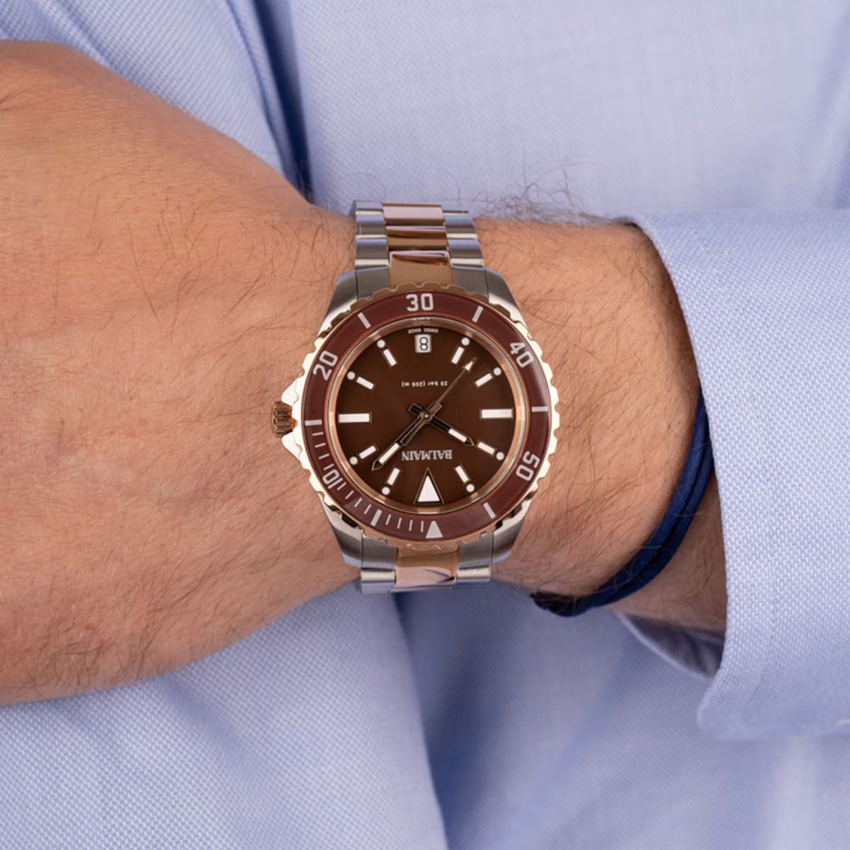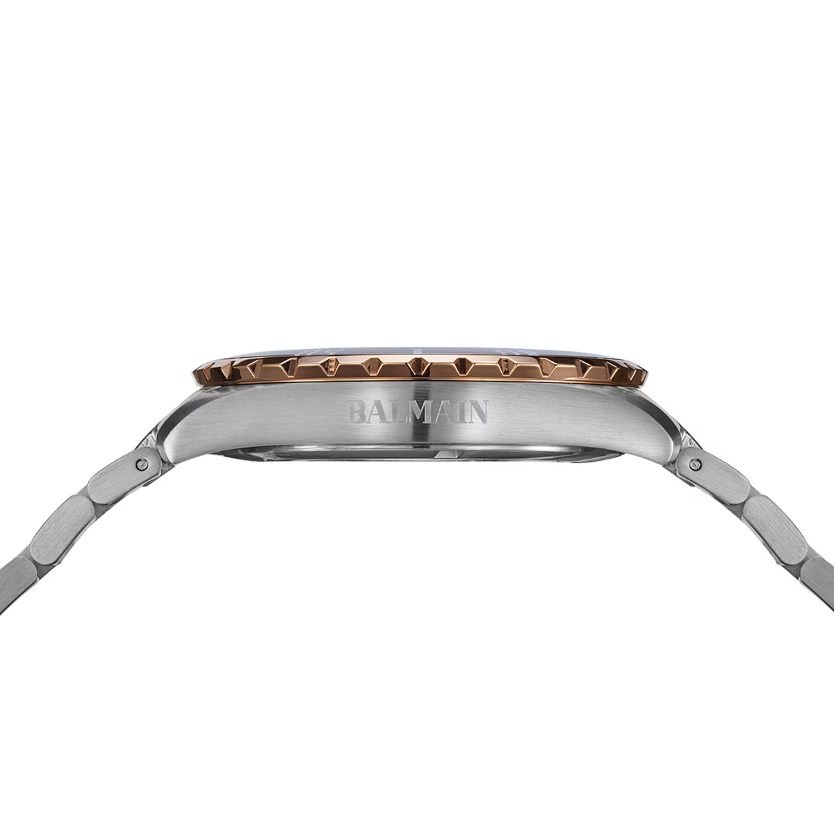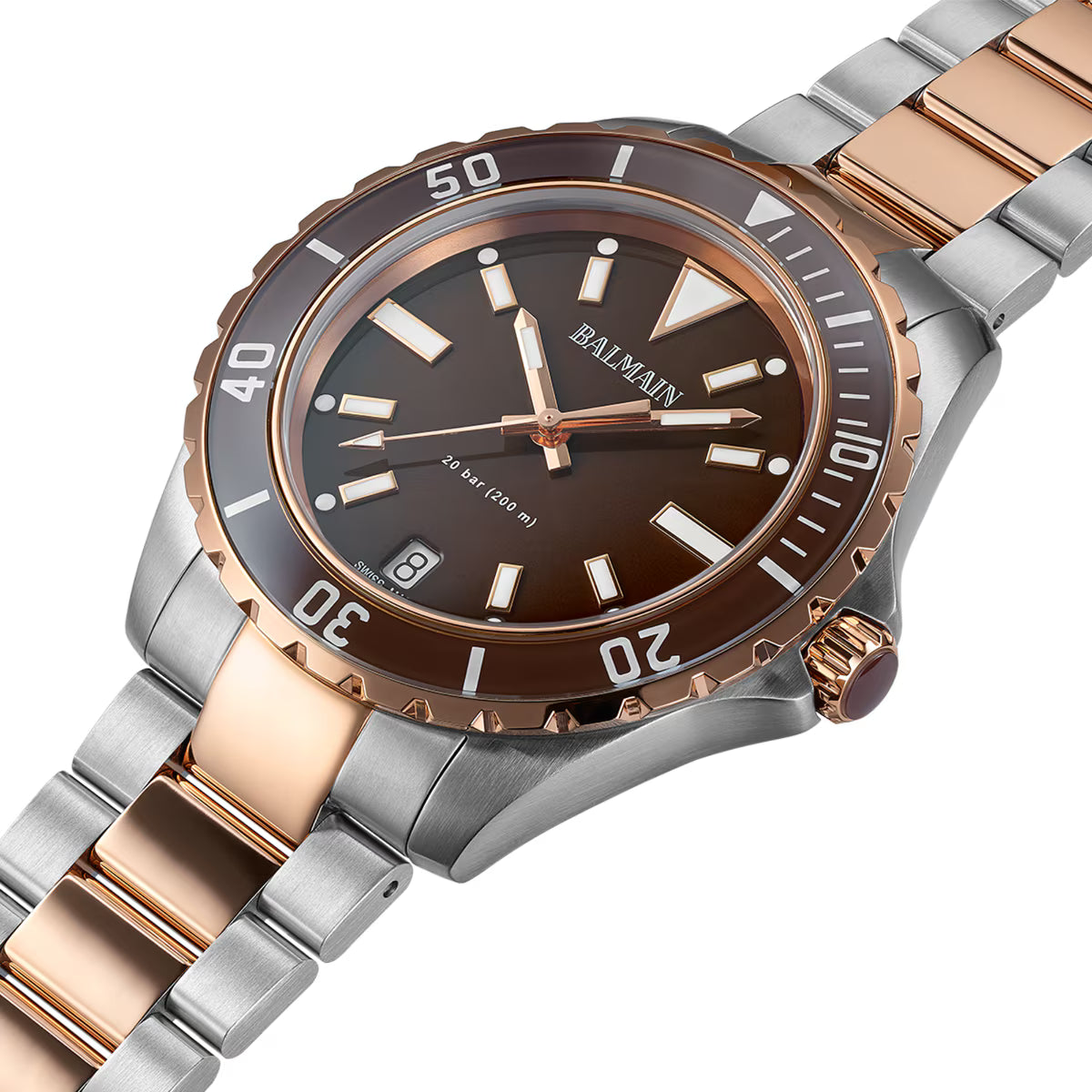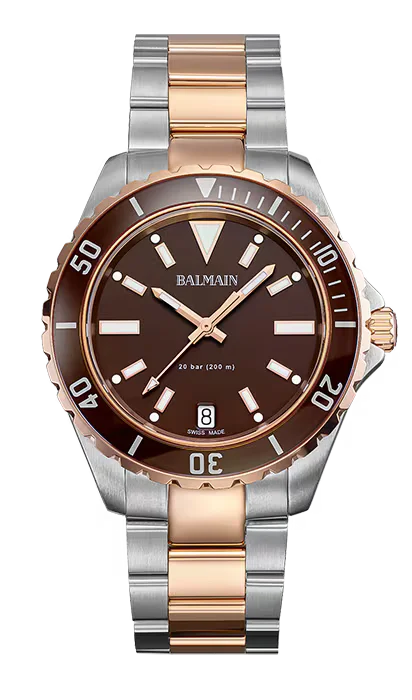 Die Balmain Ophrys (Ref. B4348.33.55) kombiniert edles Bicolor-Design mit sportlicher Robustheit. Das 42,50 mm Gehäuse aus 316L-Edelstahl mit goldfarbener PVD-Beschichtung harmoniert perfekt mit dem bicolor Edelstahlarmband. Das warme braune Zifferblatt wird von kratzfestem Antireflex-Saphirglas geschützt. Ausgestattet mit dem präzisen ETA F07.115 Quarzwerk und einer Wasserdichtigkeit von 20 bar (200 m) ist diese Uhr sowohl elegant als auch funktional. Lieferung in der originalen Balmain Box mit 2 Jahren internationaler Garantie.