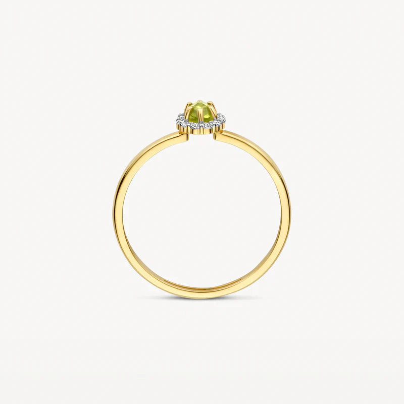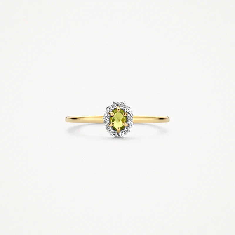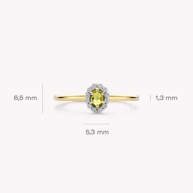 Das Herzstück dieses Designs bildet ein oval geschliffener Peridot, der von zahlreichen Zirkoniasteinen im Brillantschliff umrahmt wird. Die lebendige grüne Farbe des Peridots steht im faszinierenden Kontrast zum warmen Goldton und verleiht dem Ring eine strahlende Leuchtkraft – ein echter Hingucker mit femininer Ausstrahlung.