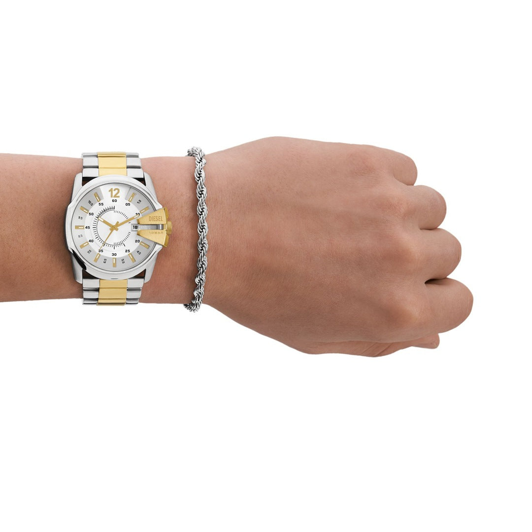 Das eigenwillige Design dieser Diesel Master Chief wird getragen, vom Gemüt des Armbands. Das Zifferblatt der Master Chief wartet mit einigen Highlights. Vor Kratzern wird das Gehäuse durch ein gehärtetes Mineralglas geschützt. Das Gehäuse aus Edelstahl beherbergt ein hochwertiges Quarzwerk, welches für höchste Präzision sorgt. Wer mit der 3-Zeiger Uhr auch vor Wasser nicht haltmacht, ist mit 10 bar Wasserdichtheit auf der sicheren Seite. Zusätzlich zur Uhr wird ein passendes Armband geliefert. Eine klassische Uhr mit sportlichen Akzenten.