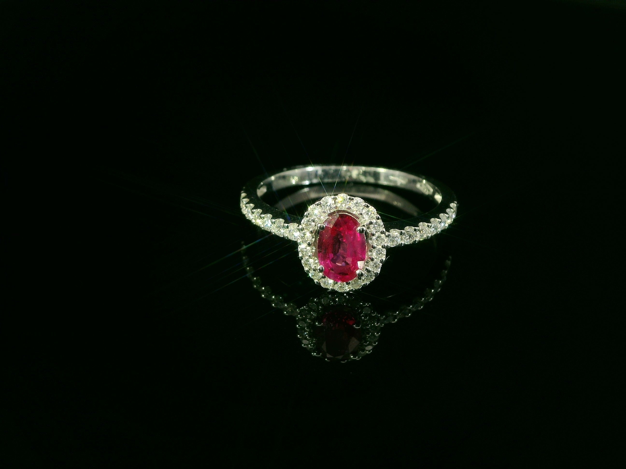Im Zentrum steht ein strahlender Rubin von 0.33ct, umgeben von 33 funkelnden Diamanten mit einem Gesamtgewicht von 0.27ct.
