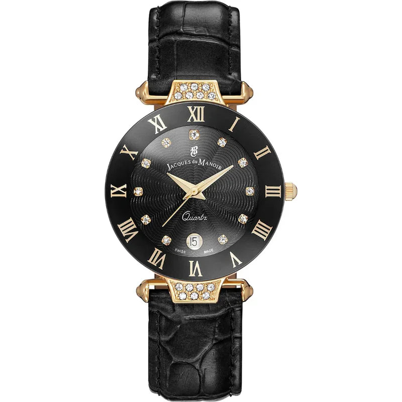 Die Jacques Du Manoir Coupole Fashion Damenuhr ist ein Inbegriff von zeitloser Eleganz und schweizerischer Präzision. Angetrieben von einem zuverlässigen Quarz-Uhrwerk bietet sie präzise Zeitmessung. Das Mineralglas schützt das stilvolle schwarze Zifferblatt, während das hochwertige Edelstahlgehäuse mit einem Durchmesser von 33 mm und das passende schwarze Lederarmband einen edlen und zeitlosen Look kreieren. Mit einer Wasserdichtigkeit von 3 ATM und der praktischen 3-Hand-Funktion ist diese Uhr ideal für den Alltag und besondere Anlässe. Erleben Sie die Qualität und Schönheit schweizerischer Uhrmacherkunst mit diesem exquisiten Zeitmesser!