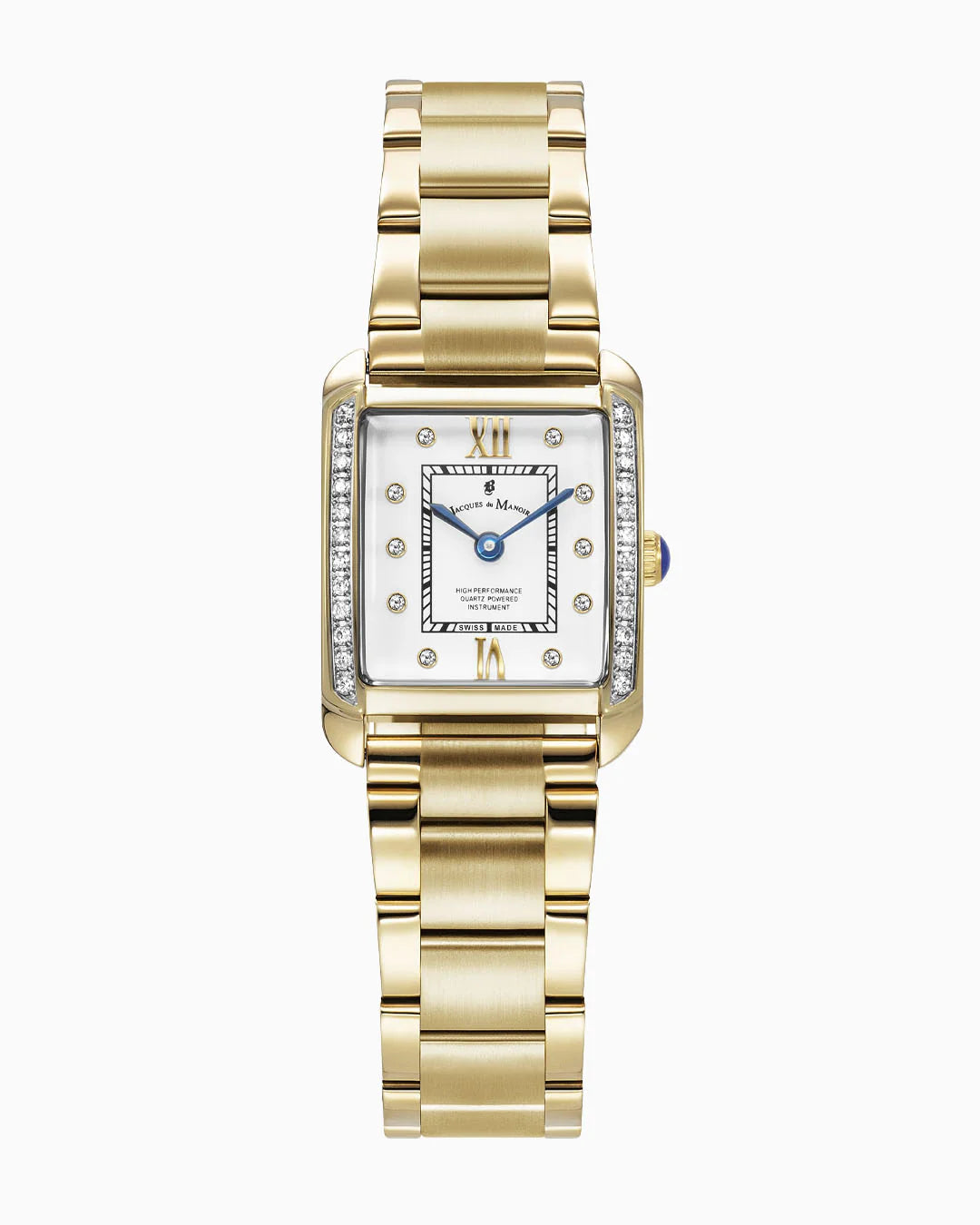 Die Jacques du Manoir Damenuhr vereint klassische Eleganz mit modernem Luxus. Das rechteckige Edelstahlgehäuse (22 x 19 mm) und das goldfarbene Armband verleihen dieser Uhr einen edlen, femininen Look.