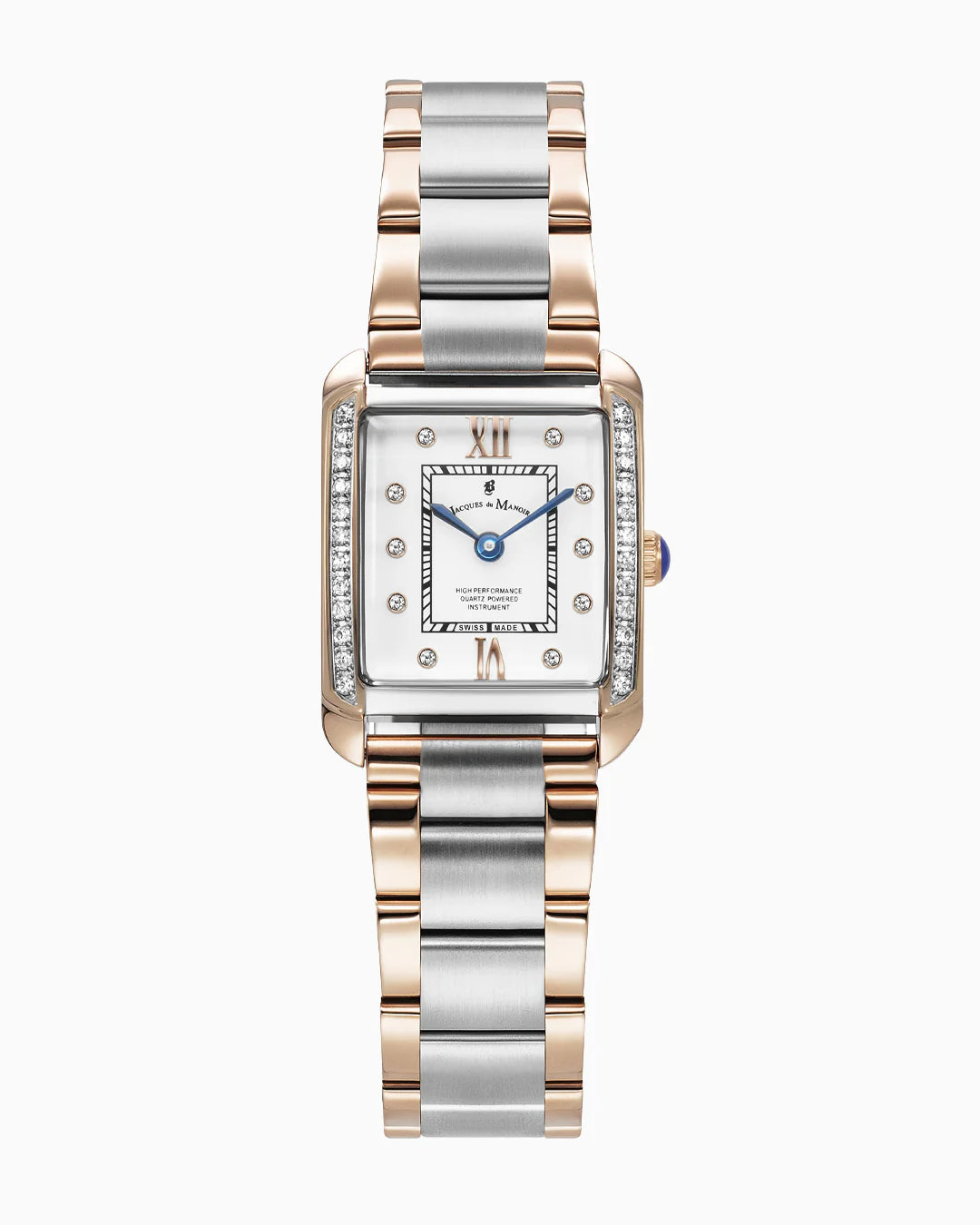 Die Jacques du Manoir Damenuhr verkörpert pure Eleganz in kompakter Form. Das rechteckige Edelstahlgehäuse (22 x 19 mm) in edlem Silber-Roségold verleiht der Uhr einen femininen, modernen Look.