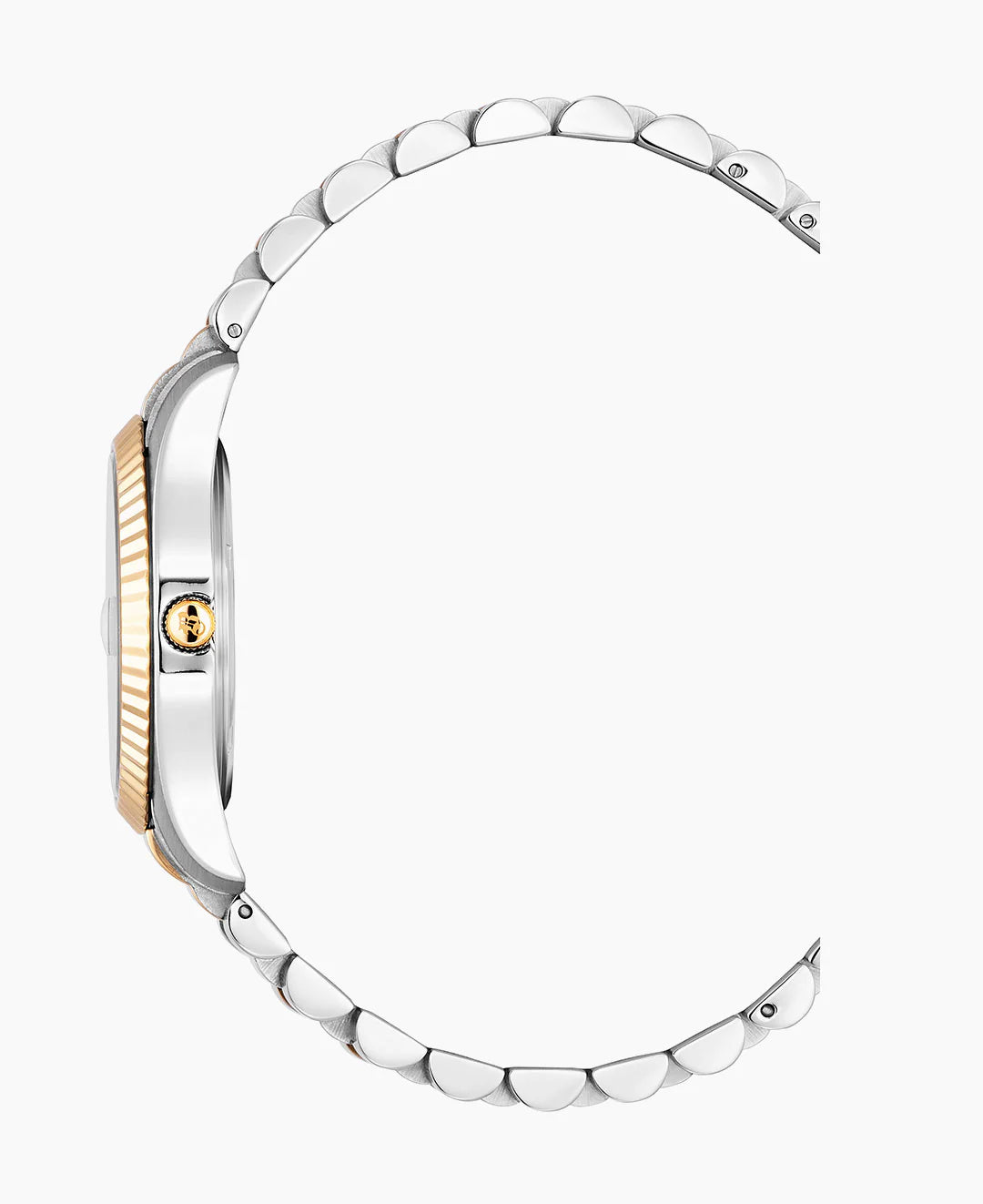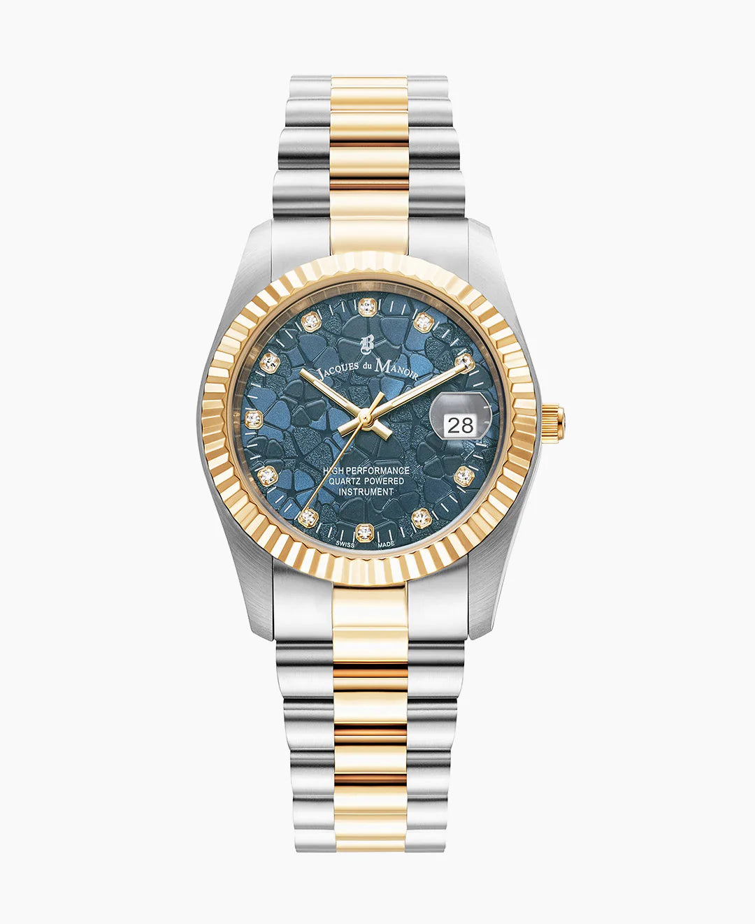Der Name sagt alles: Die INSPIRATION FLOWER führt ein tatsächlich farbenfrohes Blumenmuster auf dem Zifferblatt ein und kombiniert es gekonnt mit den charakteristischen Designmerkmalen der INSPIRATION-Familie. Diese Dresswatch ist ein echter Blickfang am Handgelenk. Die Mischung aus Blumendesign, bezaubernden Edelsteinen und raffinierten klassischen Elementen wie der geriffelten Lünette und der Krone schafft einen aufregenden Kontrast. Anstelle klassischer Stundenmarkierungen nehmen elf kühn glitzernde Edelsteine ihren Platz auf dem Zifferblatt ein, die Position um 3 Uhr wird durch ein Datumsfenster markiert.
