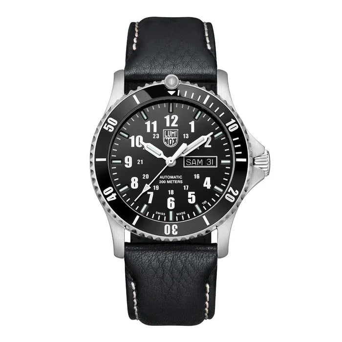 Der Luminox Sport Timer vereint ein Automatikuhrwerk mit einem sportlichen Vintage-Look. Dieses Modell ist wasserresistent bis 200 Meter und verfügt über ein Saphirglas. Das 42 mm Edelstahlgehäuse wird von einer drehbaren Lünette aus Edelstahl und Keramik umfasst. Eine verschraubte Krone und ein verschraubter Gehäuseboden runden das klassische Erscheinungsbild ab. Das Automatik-Modell ist robust und vielseitig einsetzbar, ob im Alltag oder zu speziellen Anlässen.