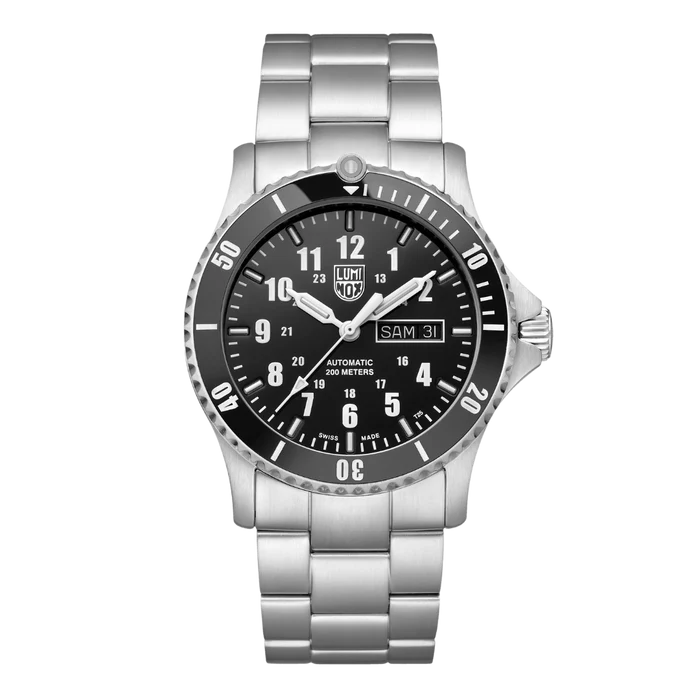Der Luminox Sport Timer vereint ein Automatikuhrwerk mit einem sportlichen Vintage-Look. Das 42 mm Edelstahlgehäuse wird von einer drehbaren Lünette aus Edelstahl und Keramik umfasst und mit einem Schnellwechselarmband aus 316L Edelstahl kombiniert. Mit einer Wasserdichtigkeit bis 200 Meter, einem Saphirglas, einer verschraubten Krone und einem verschraubten Gehäuseboden ist dieser Zeitmesser robust und vielseitig. Perfekt sowohl fürs Meer als auch für das Büro.