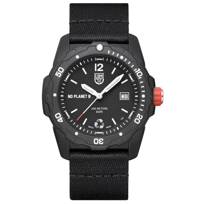 Dieser revolutionäre Zeitmesser verbindet die Präzisionsuhrmacherkunst von Luminox mit dem Abenteuergeist von Bear Grylls und der Innovation des Ozeanmaterials #tide ocean material und setzt sich gleichzeitig für den Umweltschutz ein. Das 42-mm-Gehäuse und das Armband bestehen zu 100 % aus Meereskunststoff, der in Zusammenarbeit mit #tide gesammelt wurde. Auf der Innenseite des schwarzen Armbands ist die Botschaft "I USED TO BE A BOTTLE" aufgedruckt, die den Träger an seine Herkunft erinnert. Die Uhr verfügt über ein Schweizer Quarzwerk, 200 m Wasserdichtigkeit und die Luminox Light Technology. Der Gehäuseboden hat ein einzigartiges Meeresdesign mit den eingravierten Mantras EVERY SECOND COUNTS" und NEVER GIVE UP" sowie den Logos von Luminox, Bear Grylls und #tide. Der starke und eindrückliche Schriftzug "NO PLANET B" ist auf dem Zifferblatt sichtbar und erinnert an die Schwere unserer Umweltkrise und die Notwendigkeit, jetzt drastische Veränderungen vorzunehmen.