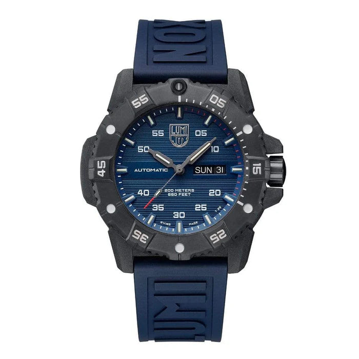Die Master Carbon SEAL Automatic mit dem SELLITA SW 220-1 Automatikuhrwerk, die auch über ein Tages- und Datumsfenster verfügt, kombiniert alle Details, für die Luminox berühmt ist - Robustheit, Leuchtkraft, extreme Wasserdichtigkeit, Ablesbarkeit.