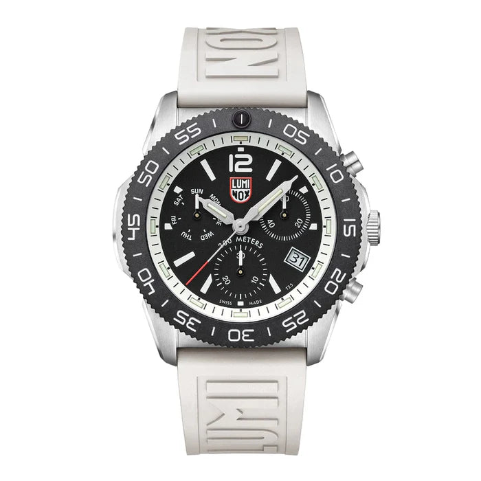 Die neue Pacific Diver Chrono ist eine schöne Ergänzung der Chronographenserie. Ein Edelstahlgehäuse, CARBONOX™ eine einseitig drehbare Lünette, ein unverzichtbares Instrument für jeden Taucher und ein weisses, passgenaues Kautschukarmband - für einen einfache und perfekte Passform.