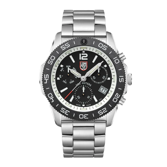Dieses edle, sportliche Design verfügt über ein 44 mm-Edelstahlgehäuse mit einer einseitig drehbaren CARBONOX™-Lünette - unverzichtbar für jeden Taucher. Der Chronograph mit schwarzem Zifferblatt, drei Ton-in-Ton Hilfszifferblättern und einem weißen Innenring verfügt über ein Schnellwechselarmband aus 316L Edelstahl - für eine einfache und perfekte Passform. Wie jeder andere Luminox Zeitmesser ist auch die Pacific Diver mit der Luminox Light-Technologie ausgestattet, die eine unübertroffene Ablesbarkeit bei allen Lichtverhältnissen für bis zu 25 Jahre gewährleistet.